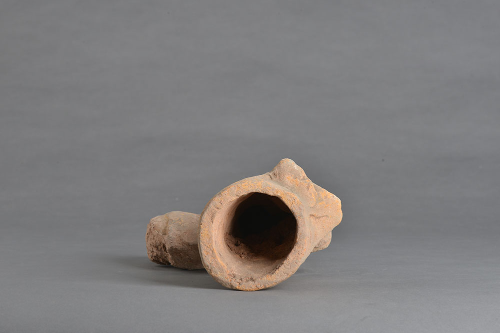 V领长袍。头向左微扬,面带微笑,右手向上高高扬起,左手放于左侧腰际,左脚离开地面微微抬起,作欢乐的舞蹈状,束腰。
