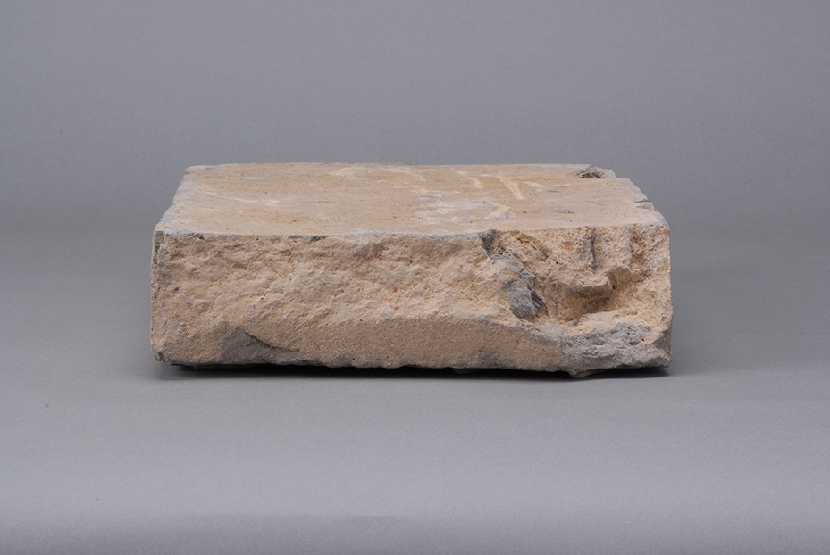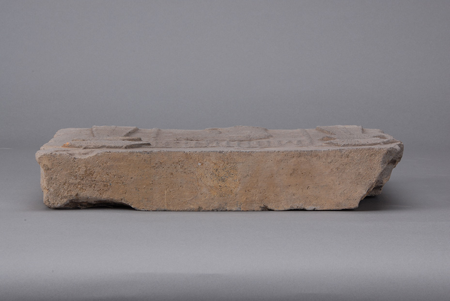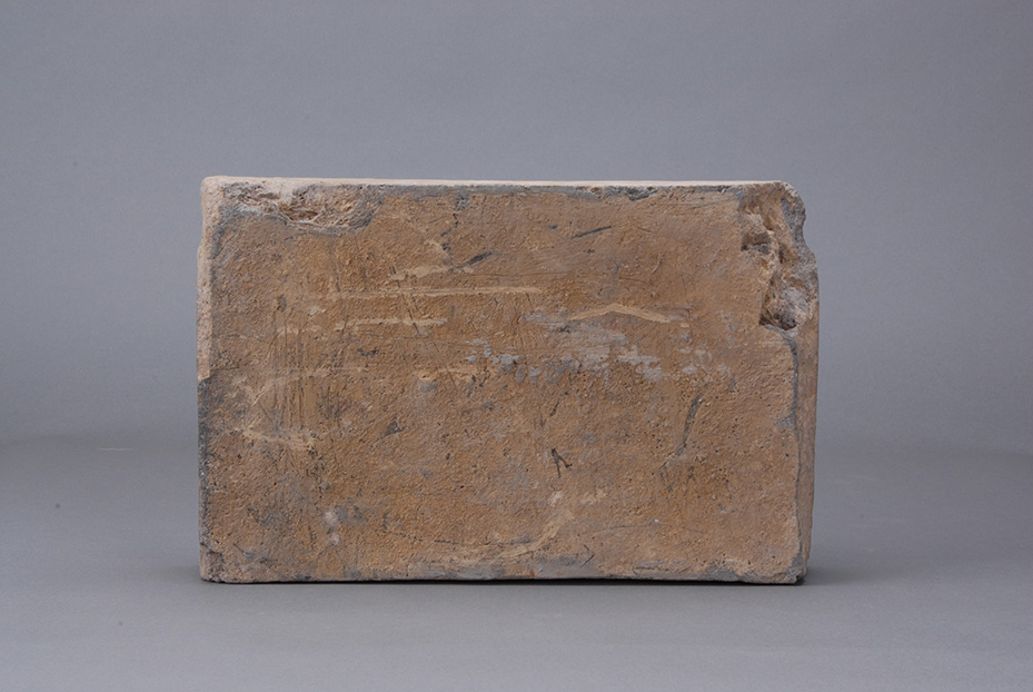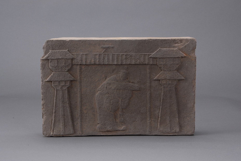 砖一面模印双阙、人物,阙为双层,双阙用屋檐相连,檐顶上有一小三角,上接有一横杠,中间有一人,躬身,头戴高冠,着长袍,系有腰带,手中拿有一物,不辨。
