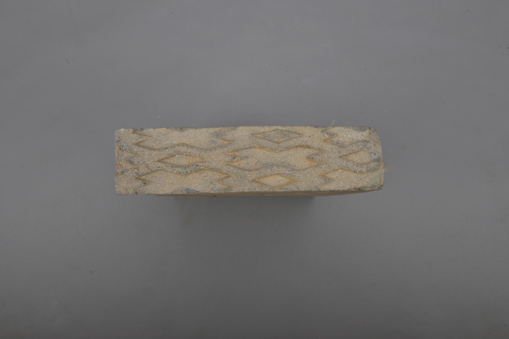 汉人形花草纹楔形砖,长34.8,宽24.2,厚8厘米,砖呈楔形,一头宽,一头窄,两侧一面为卷草纹,一侧为菱花纹。