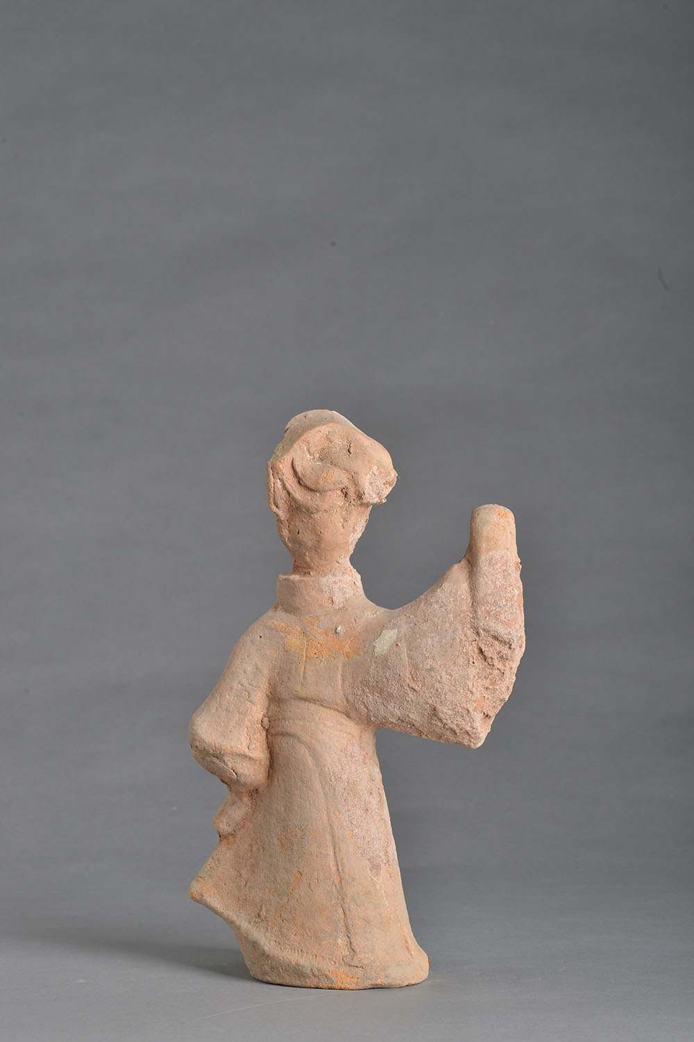 V领长袍。头向左微扬,面带微笑,右手向上高高扬起,左手放于左侧腰际,左脚离开地面微微抬起,作欢乐的舞蹈状,束腰。