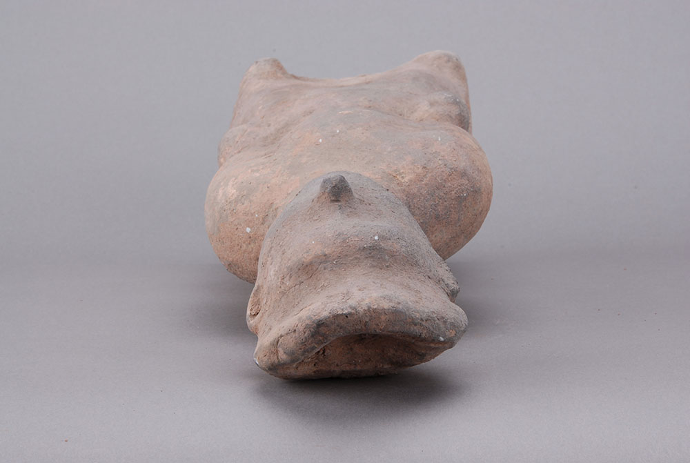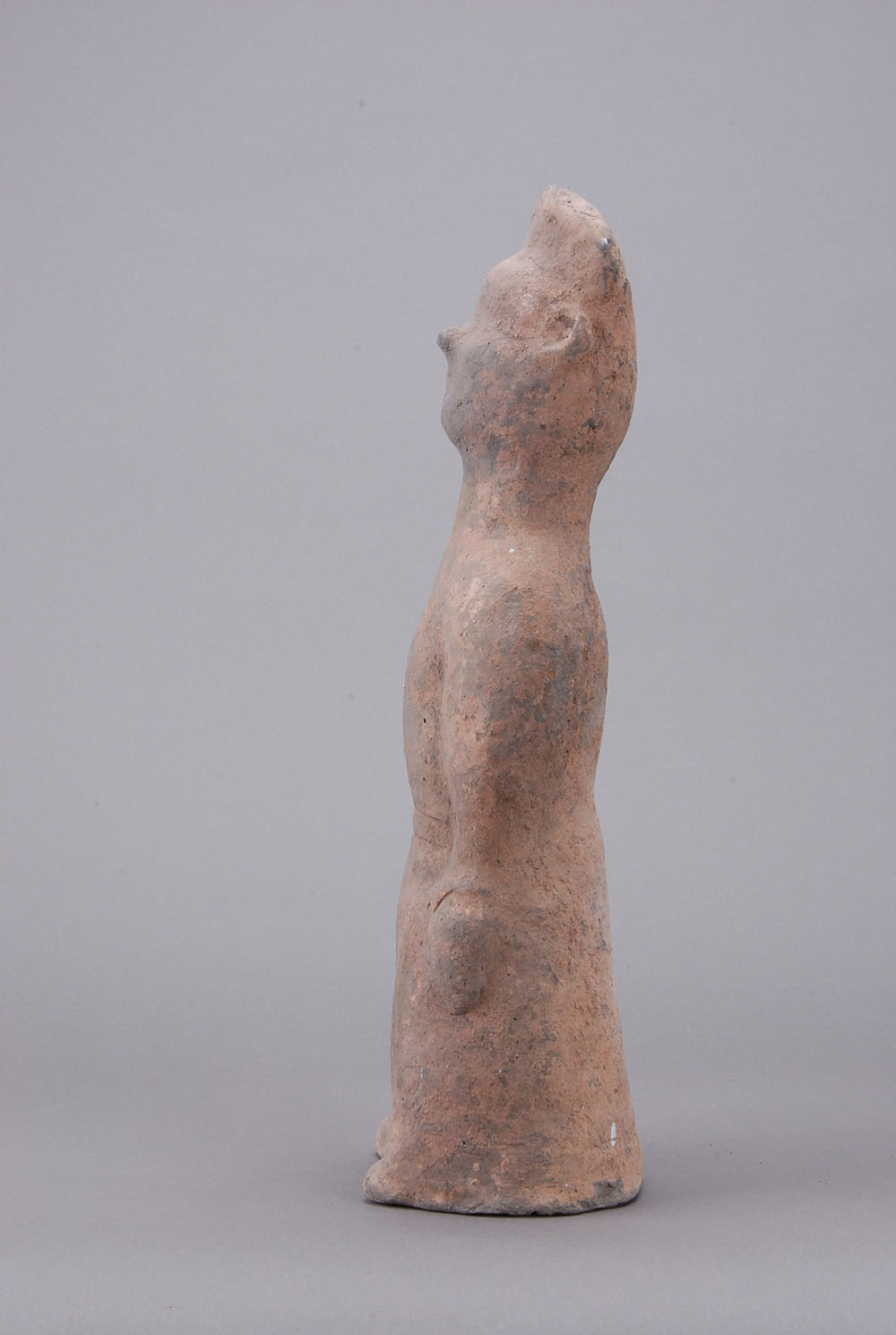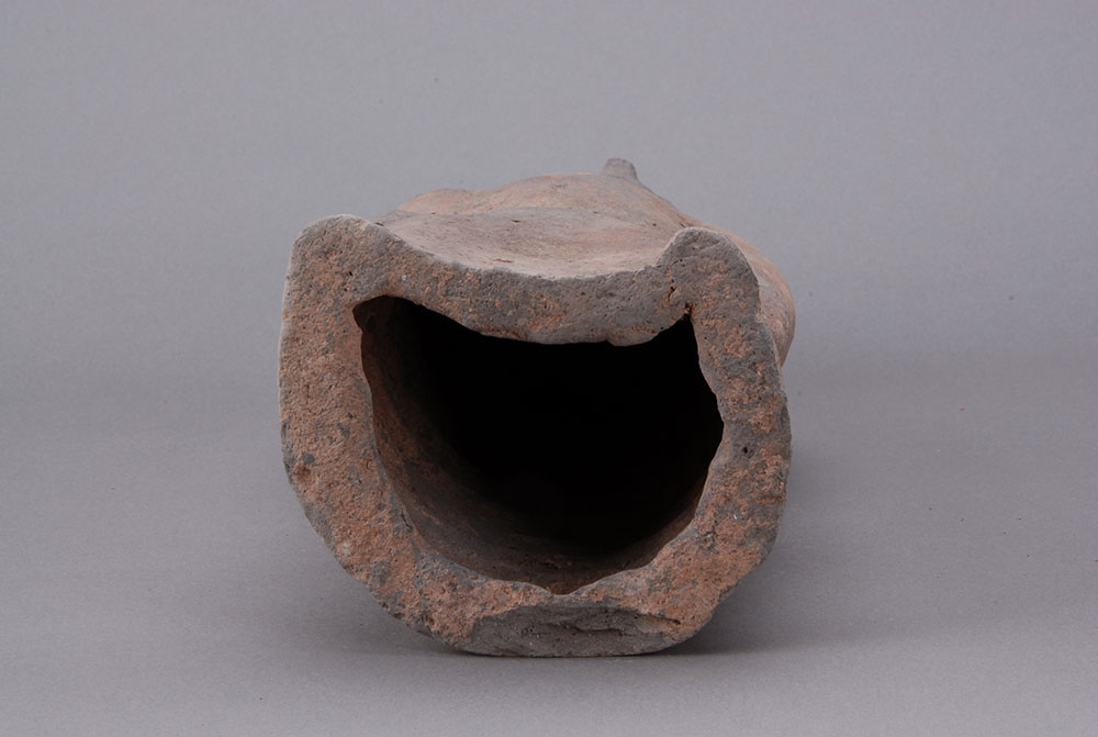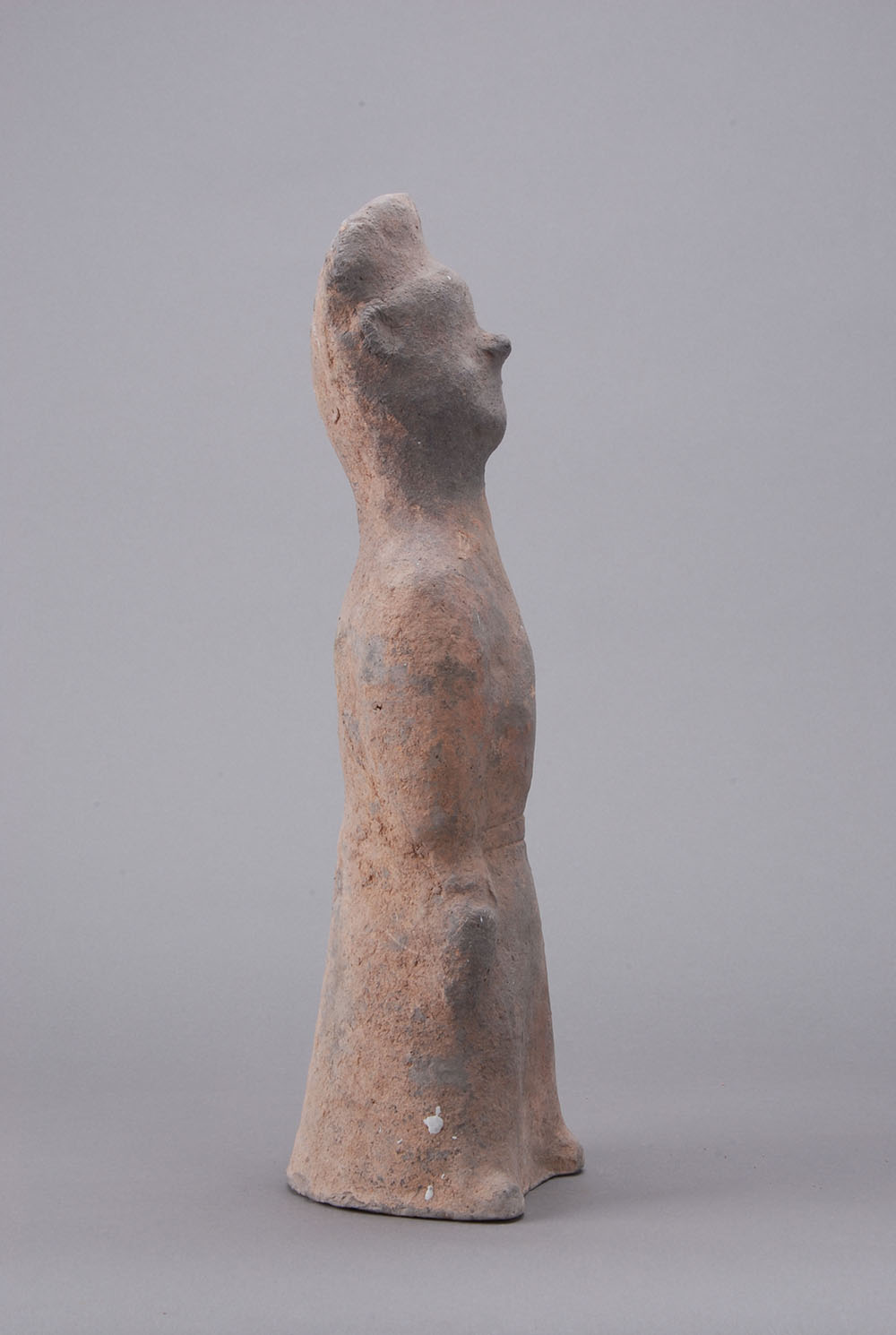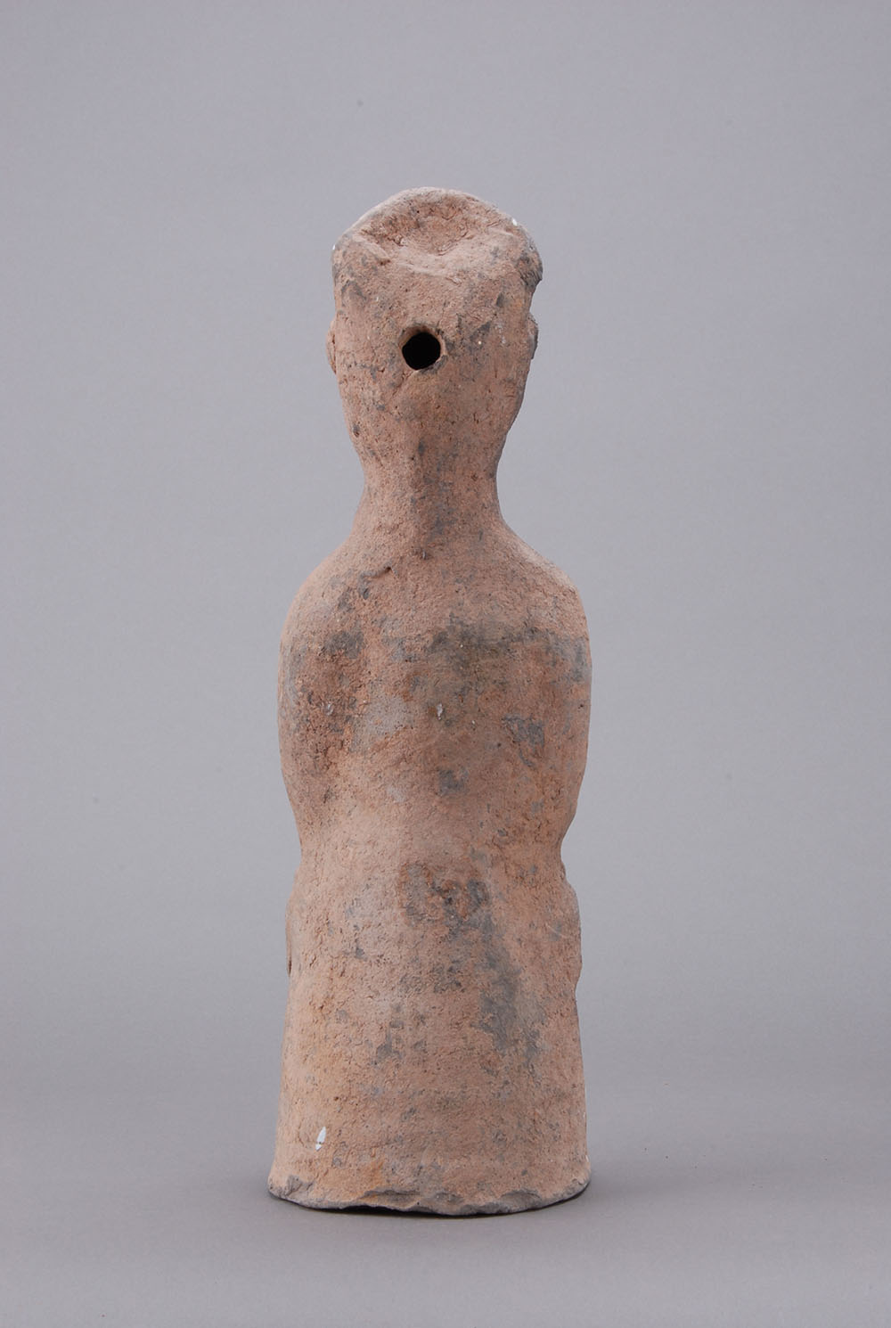 灰陶,深目高鼻,头戴高冠,仰头挺胸,着交领,长腹而立,腰系带,双手下垂,提罐。