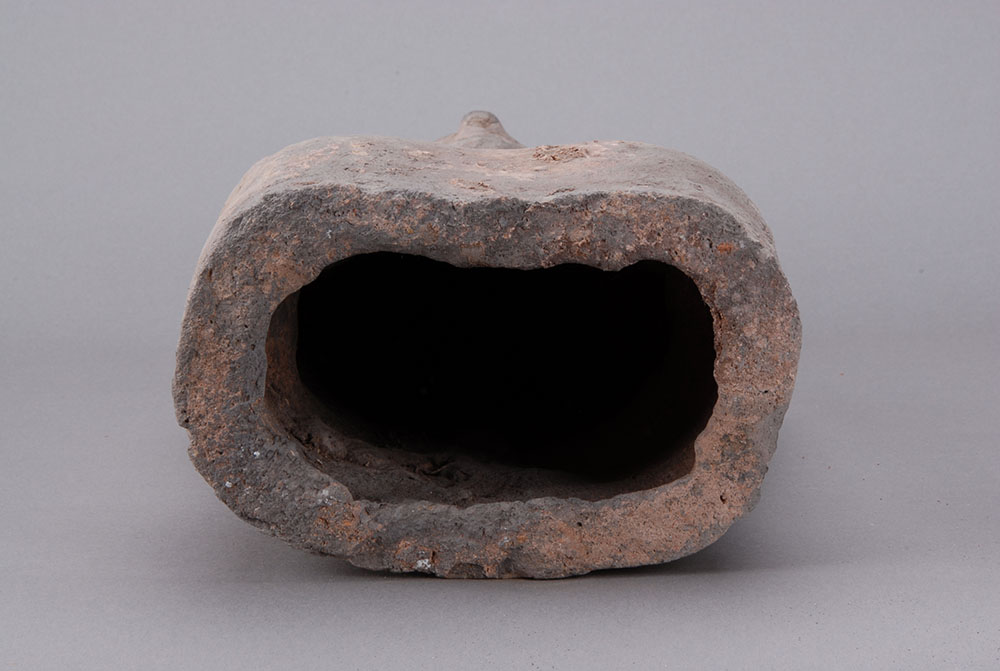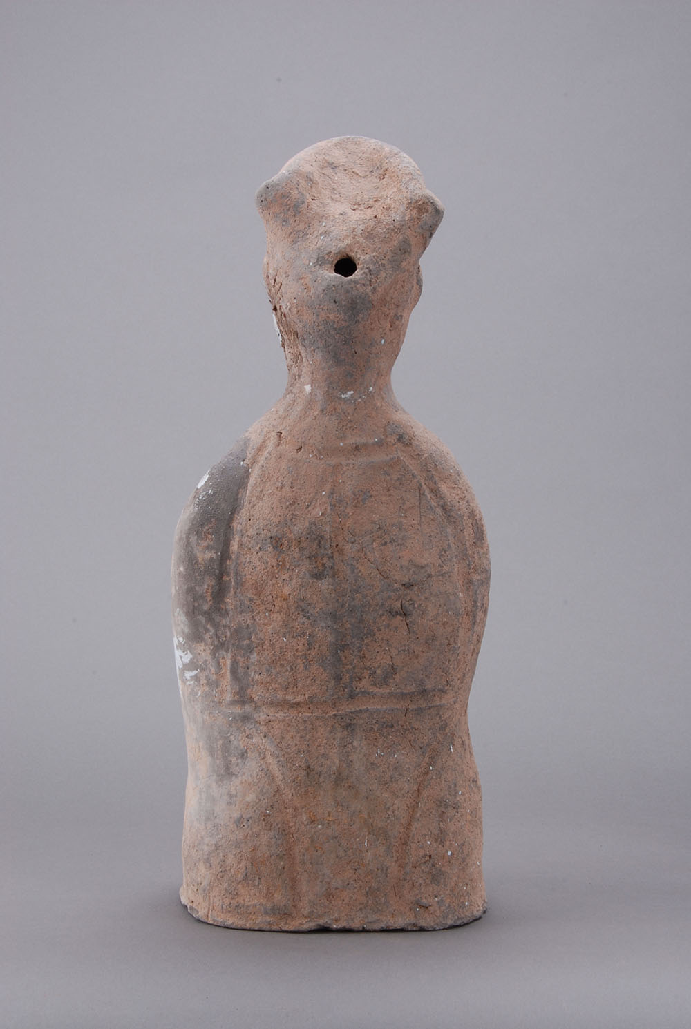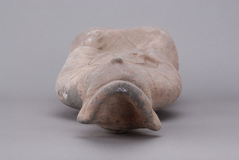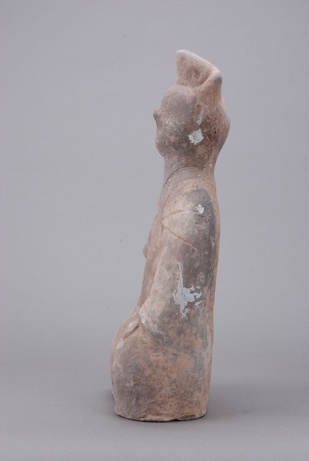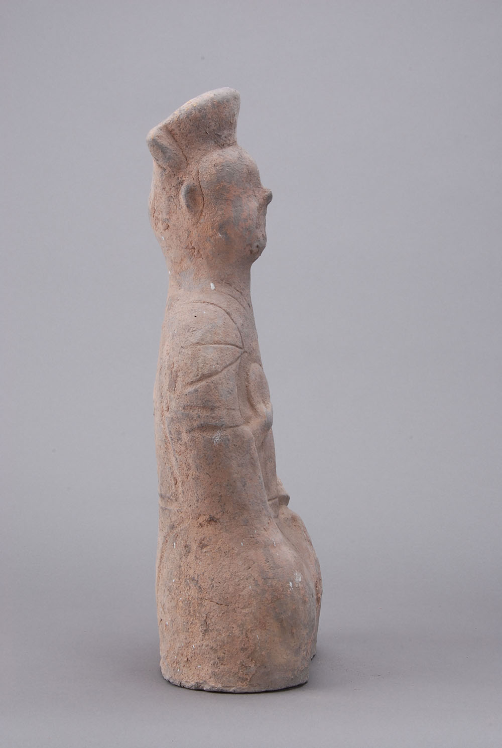 灰陶,深眼高鼻,面部丰满,略带微笑,戴高冠,着交领长服,宽袖,腰系带,跪于地上,衣纹清楚,右手执一镜于胸前,左手下垂抚膝。