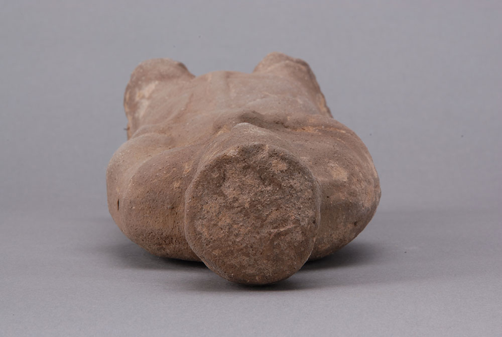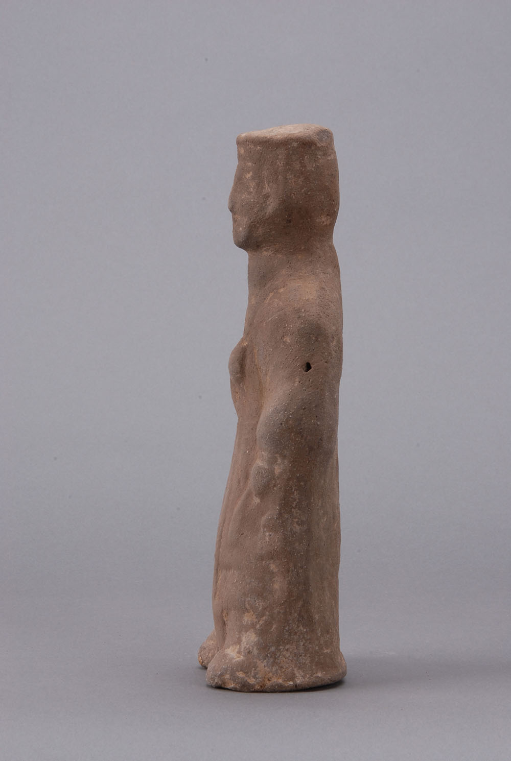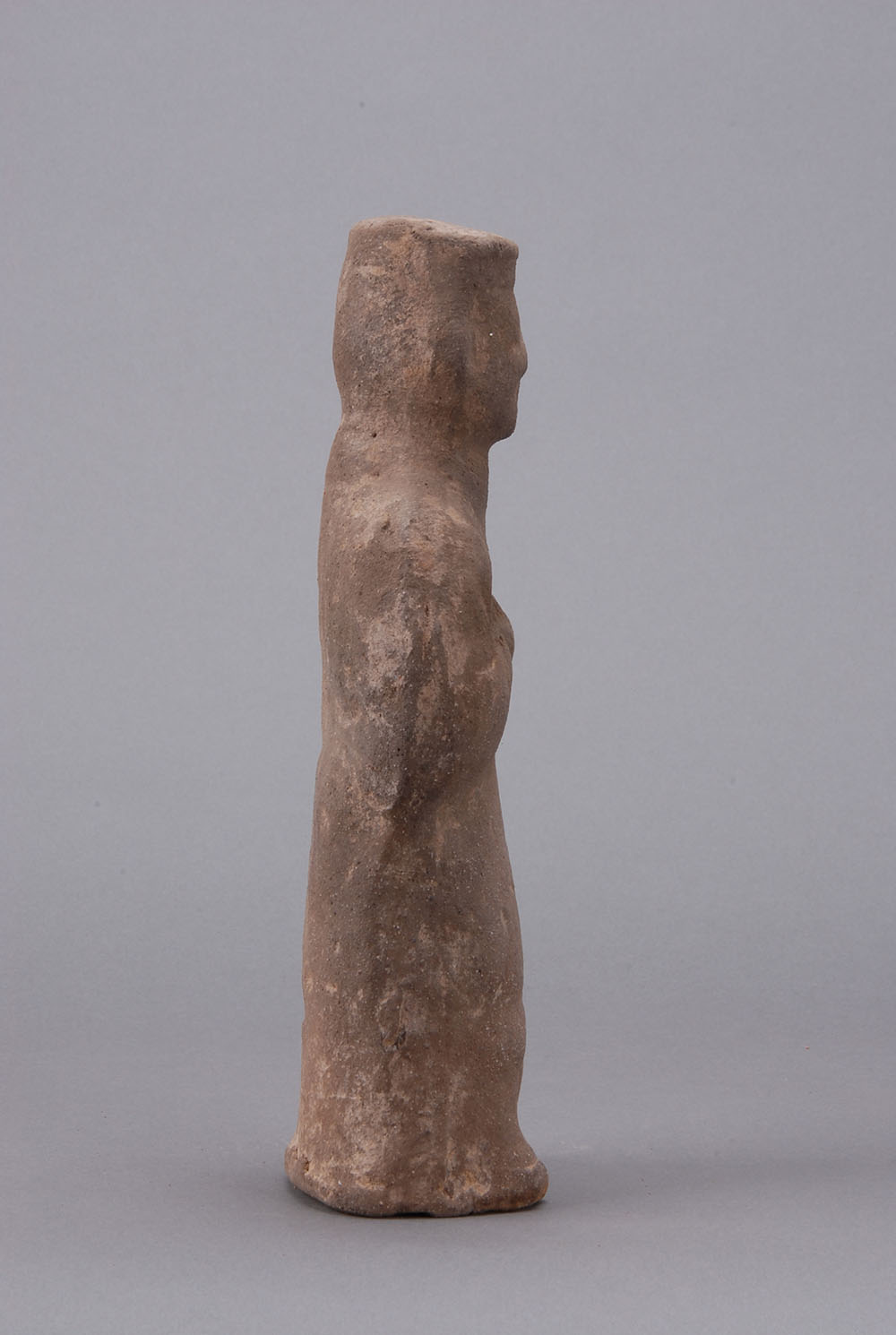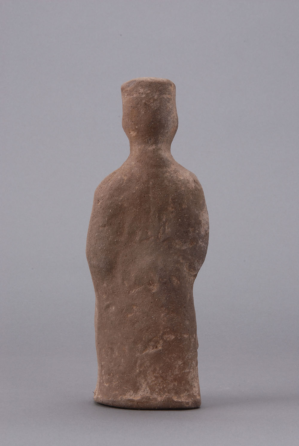 灰陶,立姿,头戴平巾帻,面部模糊,身着圆领窄袖短衣,下着短裤,右手执耜立于地,左手提罐。