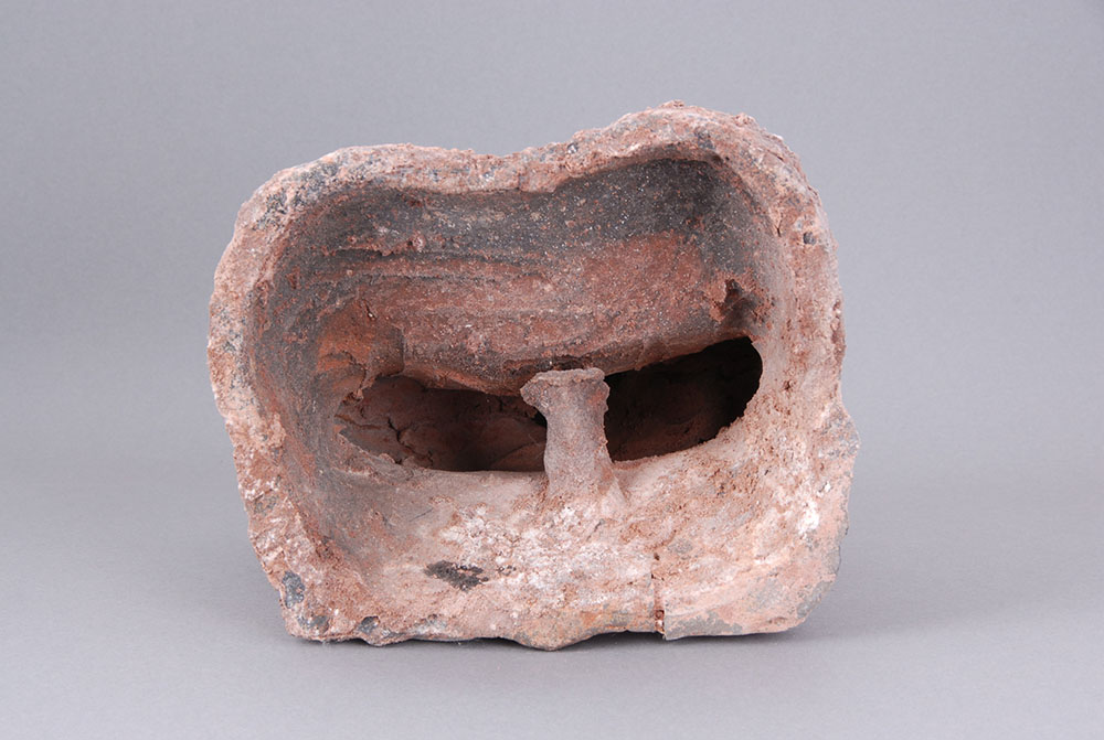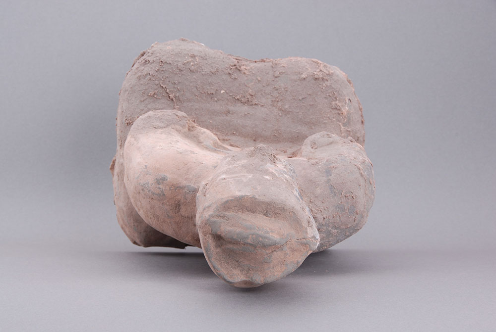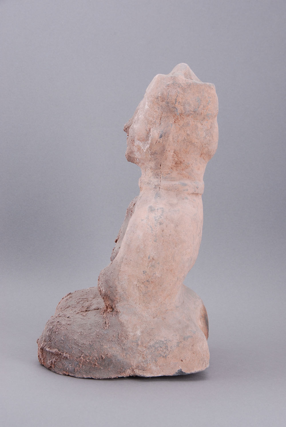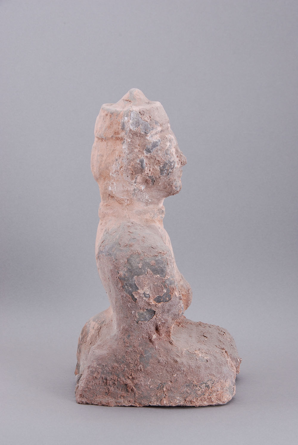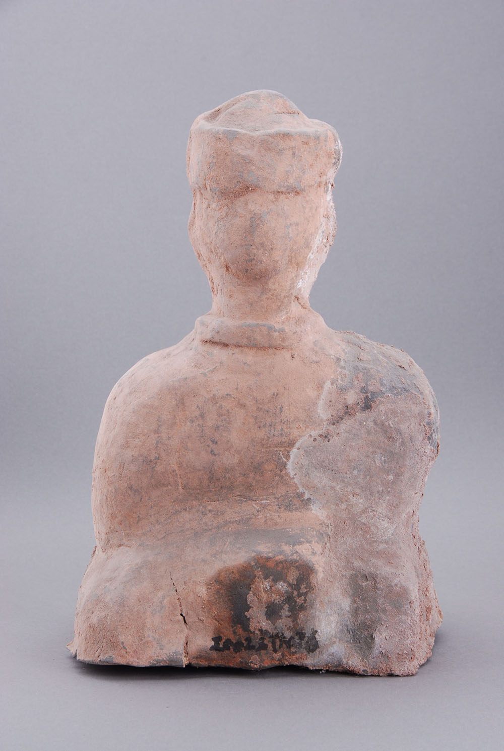 东汉灰陶持剑俑,高24.5,宽14,底宽18.5厘米,泥质红陶,头上戴帻。顶隆起,帻带从顶上穿过,下垂至颈,脸方圆,眉目清楚,长颈,身着右衽宽袖长裙,右手执圜首剑于胸前,左手持盾牌于腰际,盾上带弧形把。腰有束带。