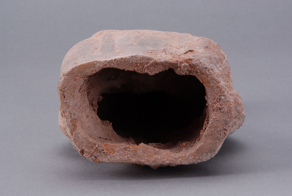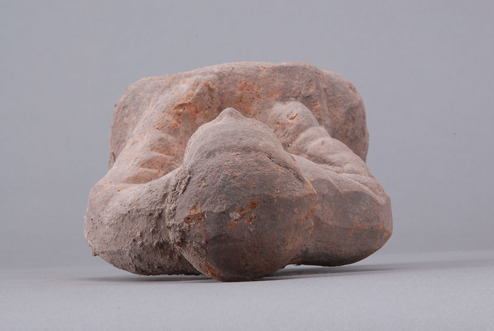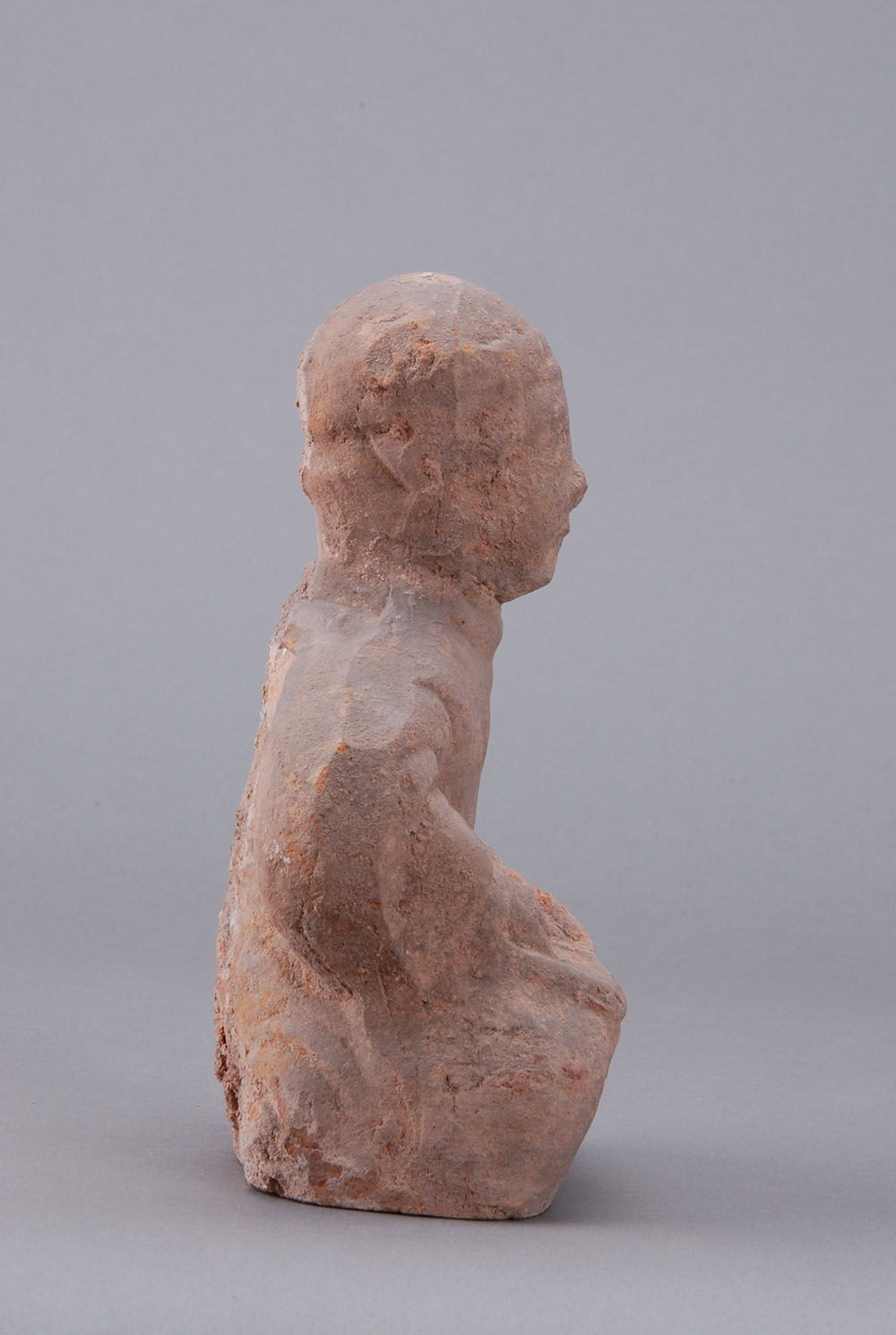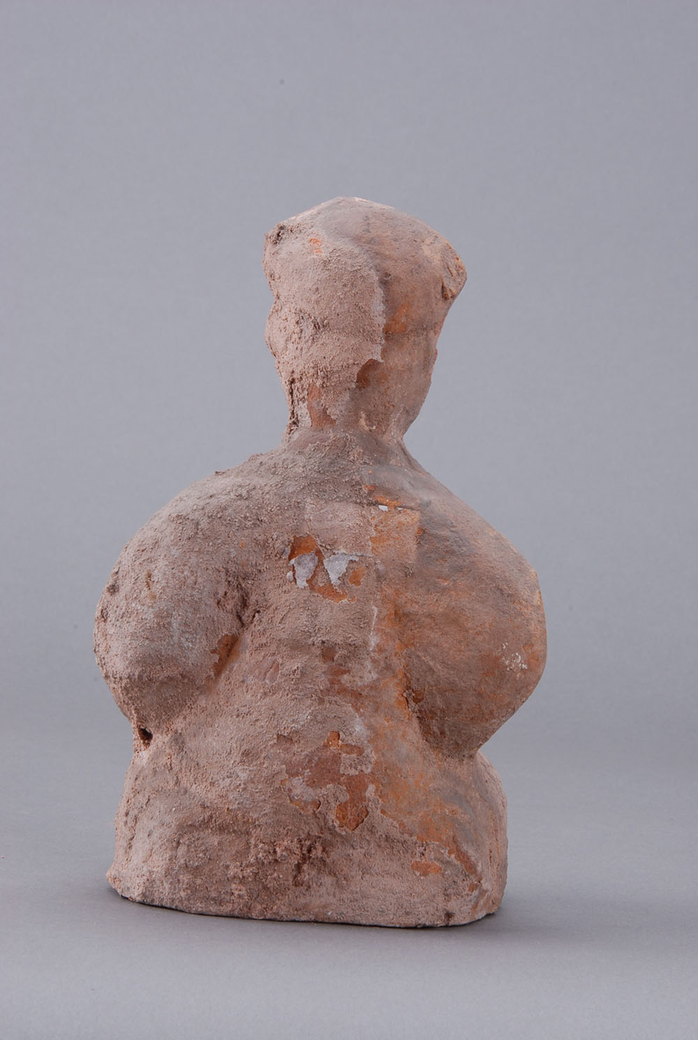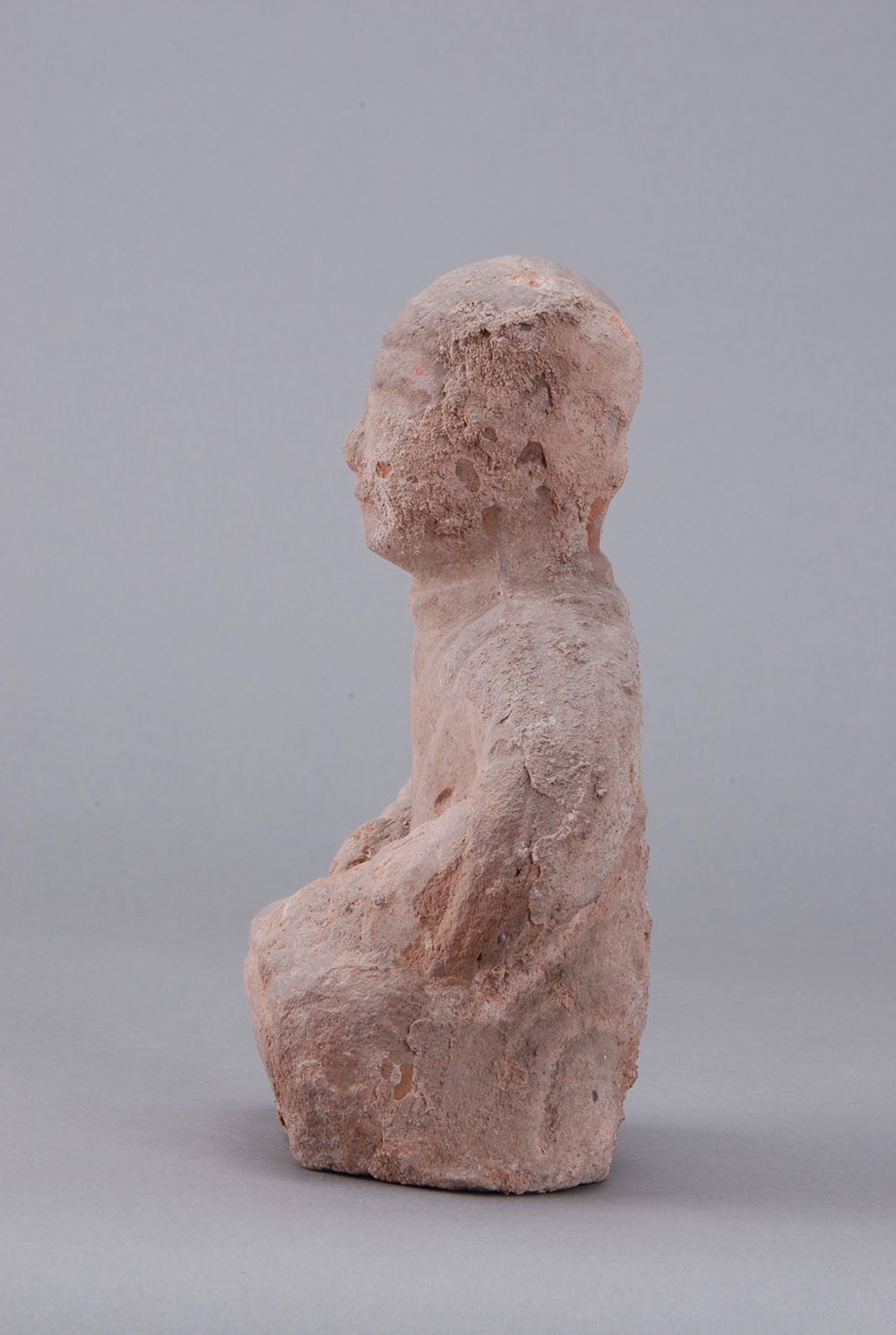 夹砂黄褐陶,中空,挽髻,面部模糊,着交领衣,盘腿而坐,案放于膝上,双手放于案。
