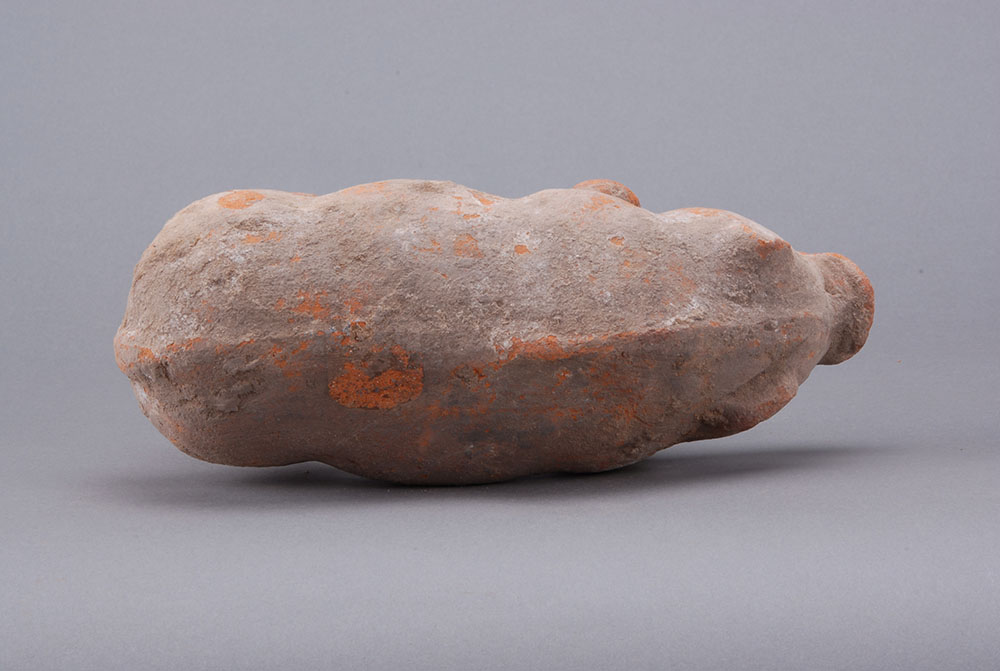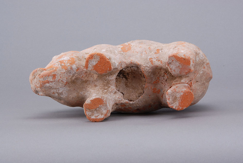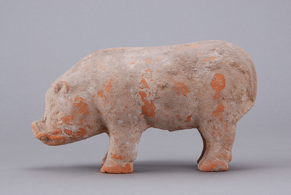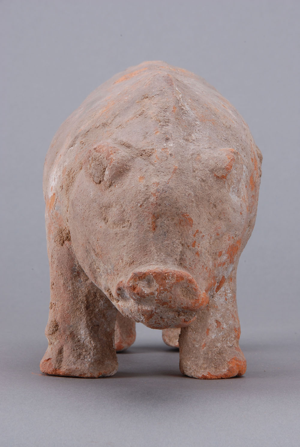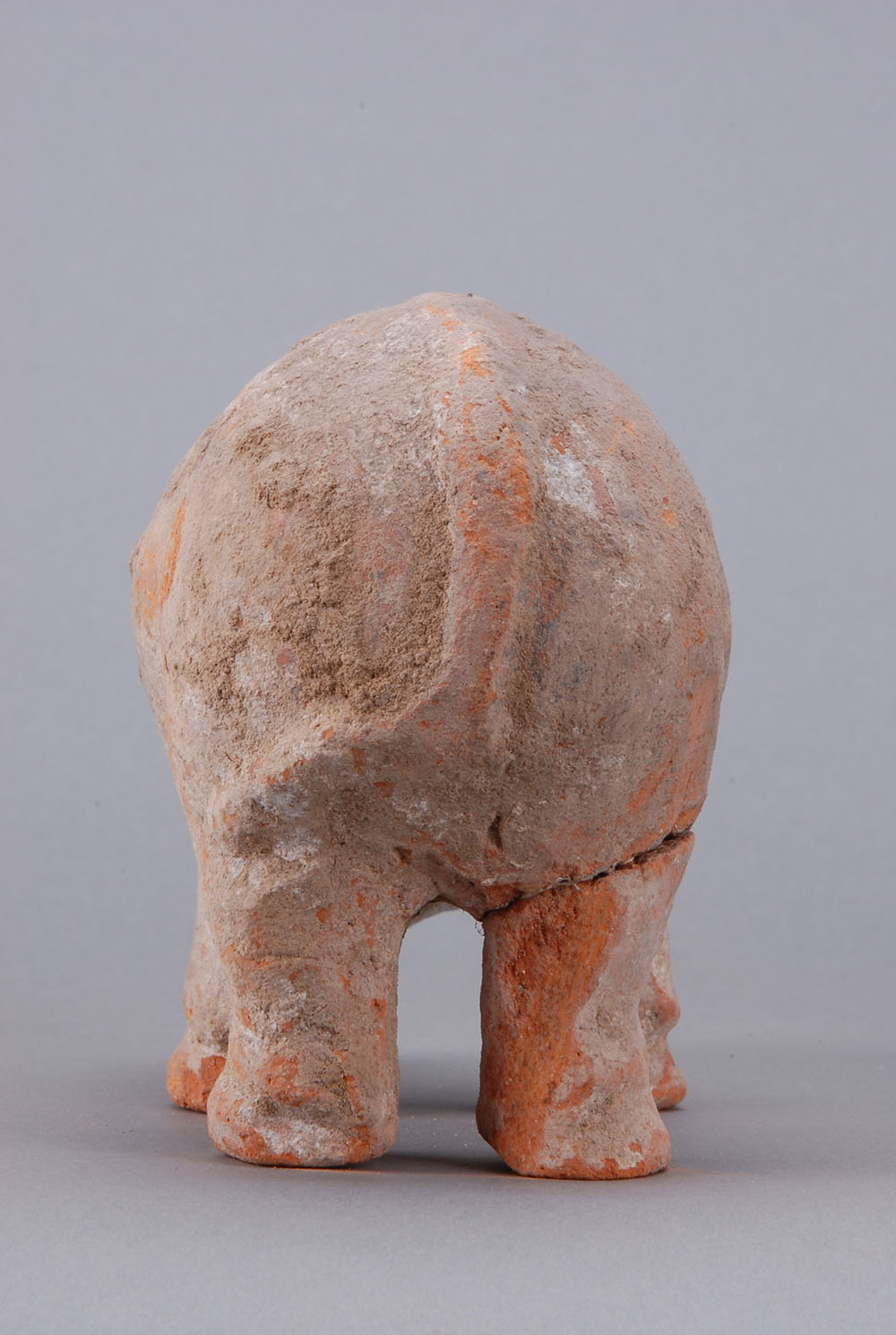 红陶,圆眼,竖耳,嘴角上翘,头微低,体肥膘壮,尾细长,向一侧下垂,四肢健壮立于地。