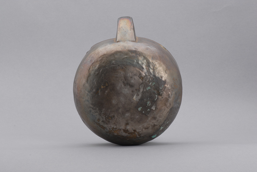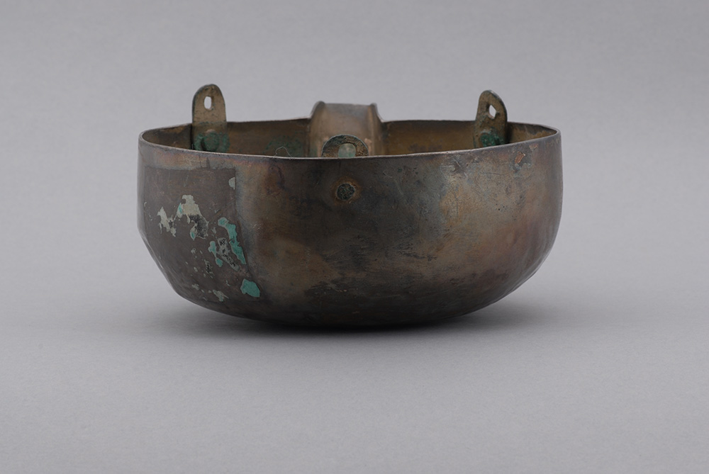 口微敛,方唇,弧腹,圜底,方口流,内壁有三耳用以系绳。