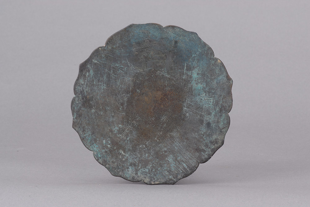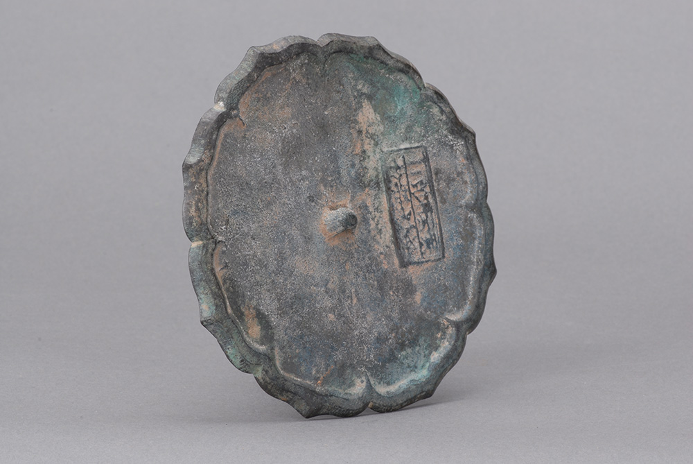 八瓣菱花形,镜背有一小半圆形钮,镜背铸有两行文字,模糊不可辩识。