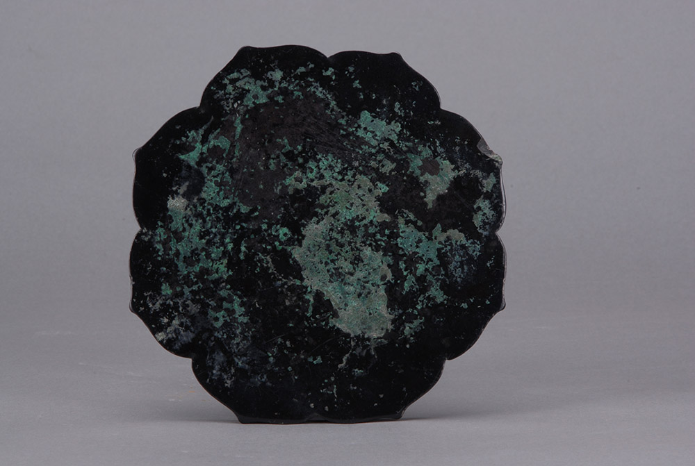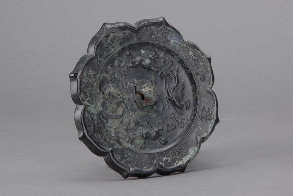 呈八瓣菱花形,背中央有蟾蜍形钮,钮四周高浮雕鸾凤,麒麟纹各一对,间隔以折枝花纹,近缘处四组流云,四组花纹相间环绕。