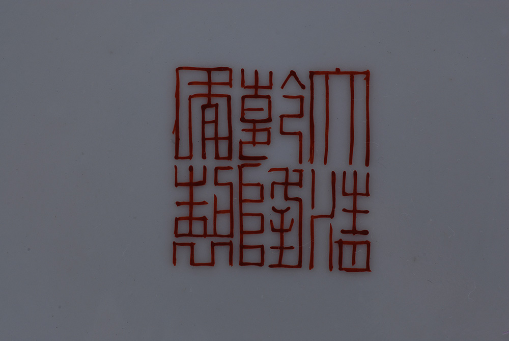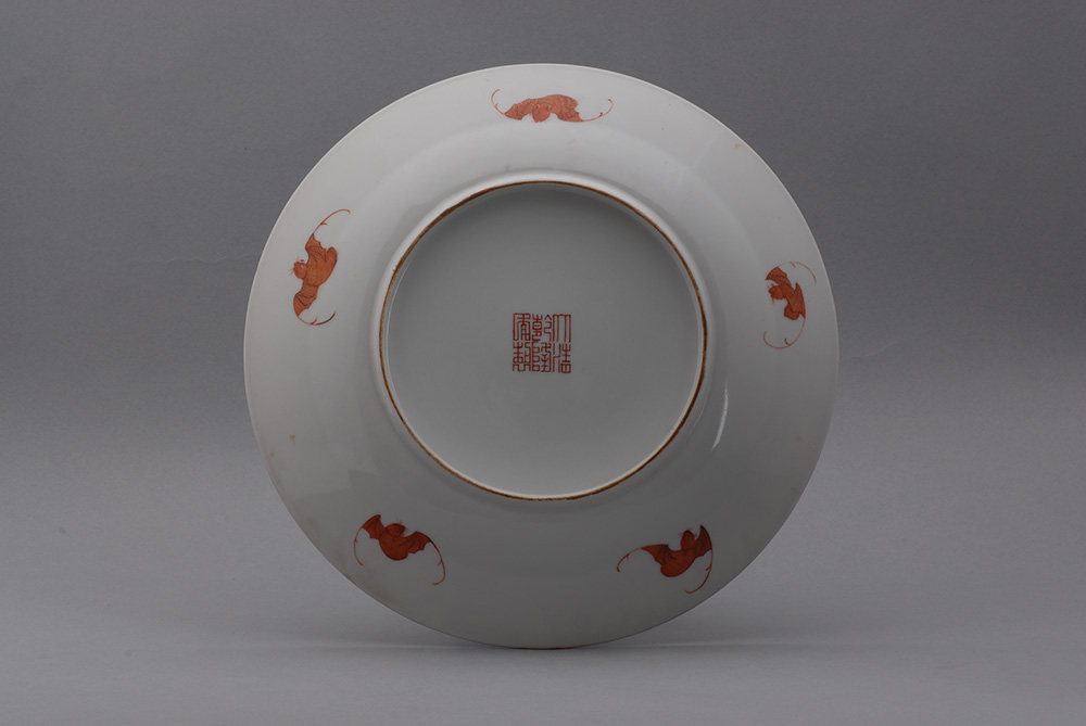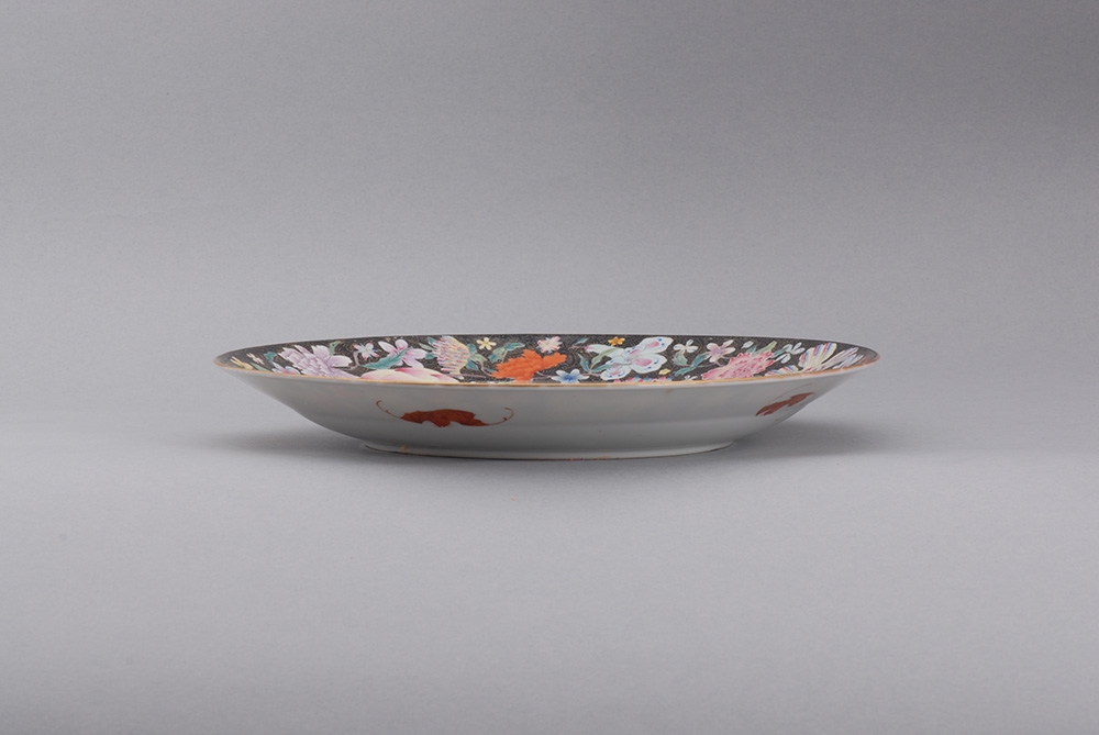 清乾隆粉彩花卉瓷盘,口径24.4,通高3.1,足径13.2厘米,敞口,圆唇,浅弧腹,口沿描金,圈足。褐底上描金有细小“凤尾纹”上面满饰粉彩花卉,习称“锦上添花”。盘内心为牡丹,另有菊花,荷花等。盘外壁绘有五只倒立蝙蝠。器底篆文“大清乾隆年制”。