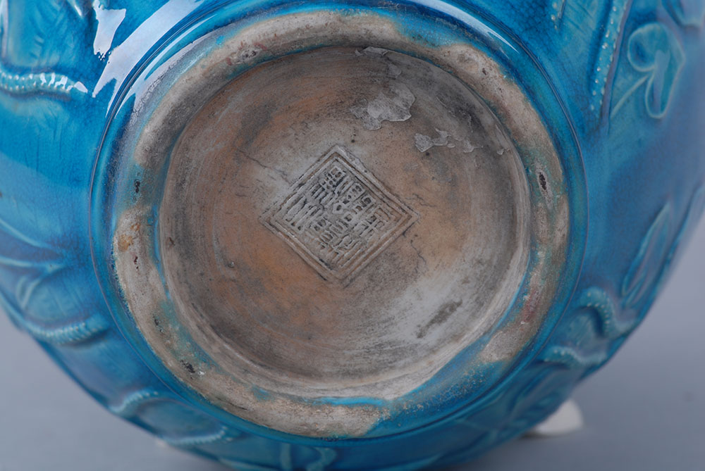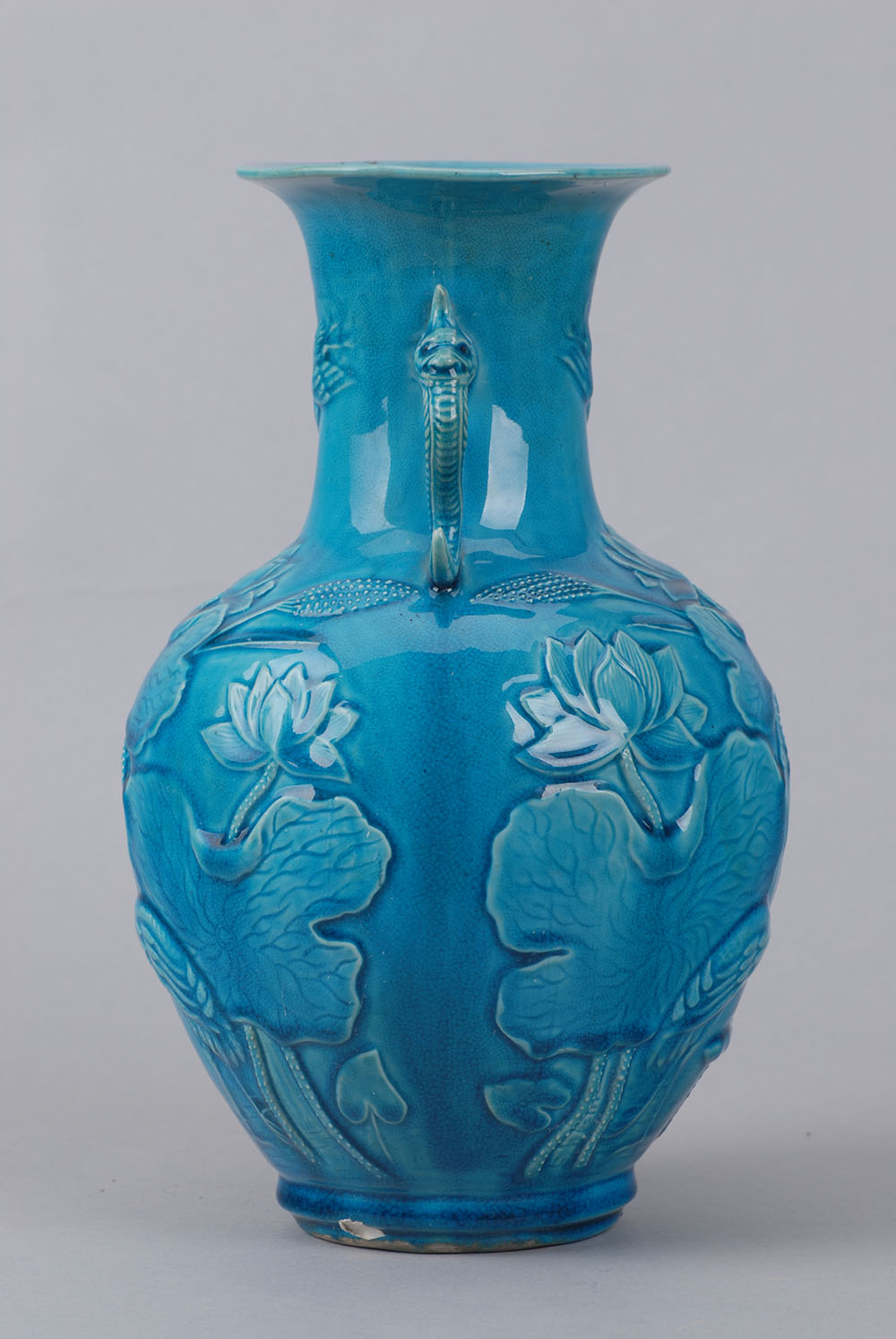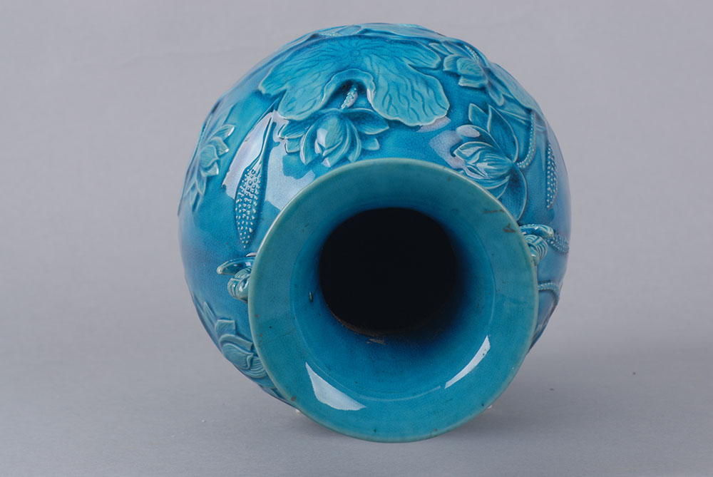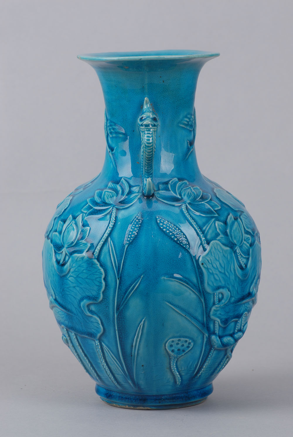 口径11.7,高29,足径9.1厘米,侈口,束颈,颈二侧各有一龙首耳,鼓腹,圜底,浅圈足,蓝地,腹部剔划以荷花,鹭丝图案。器底篆文“大清乾隆仿古”。