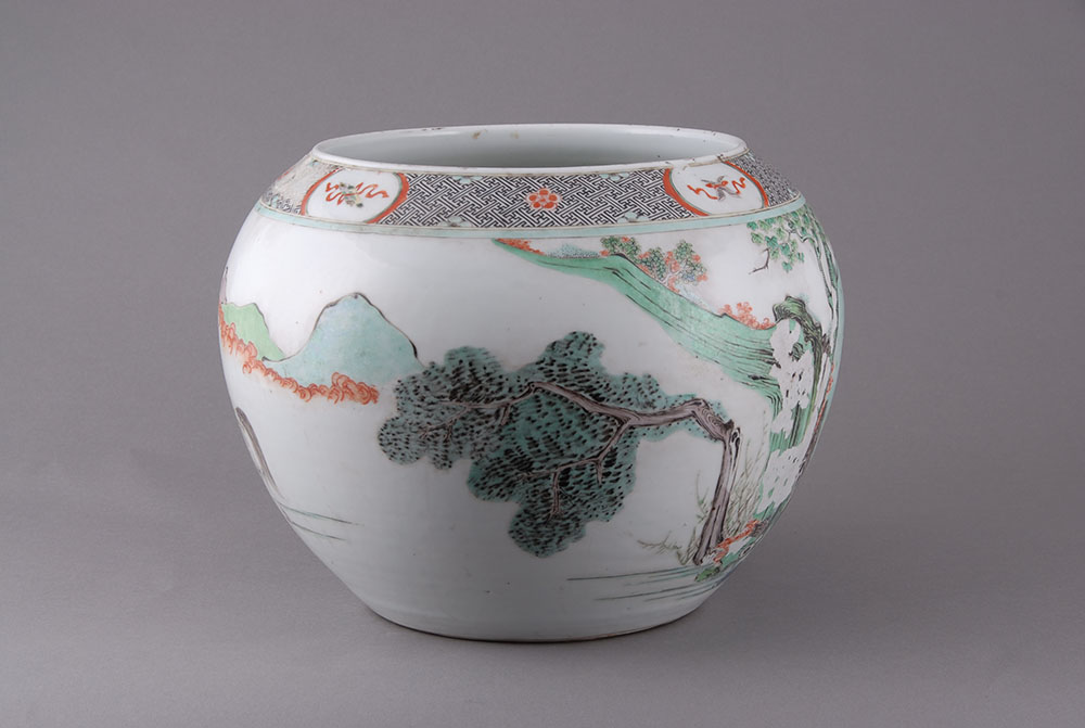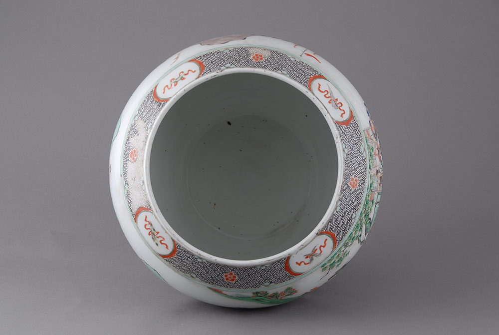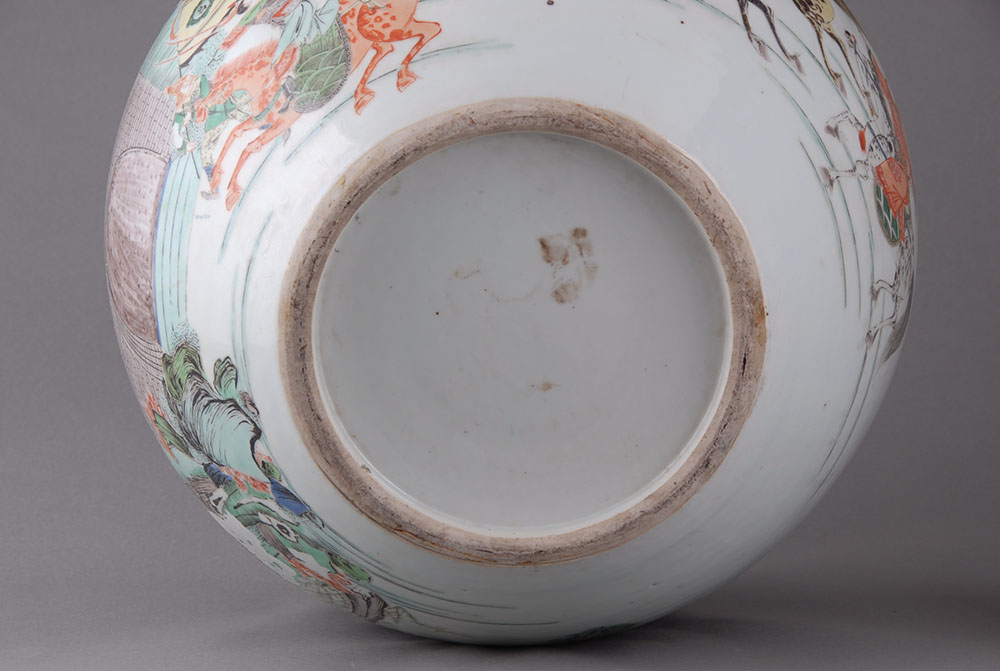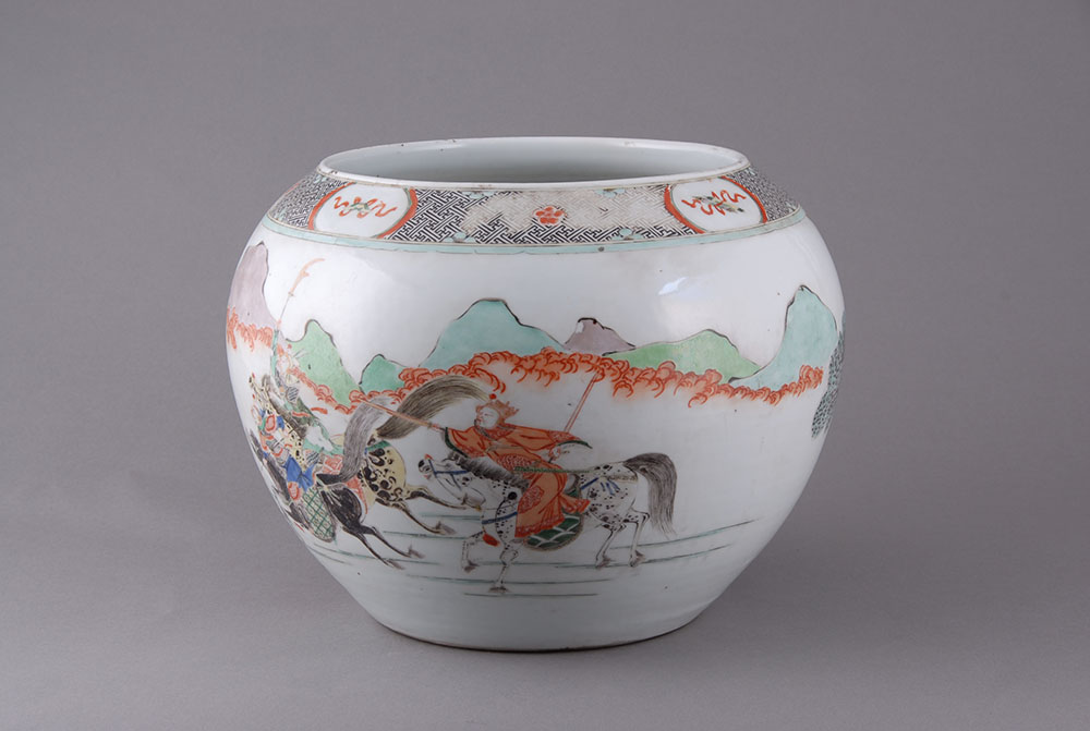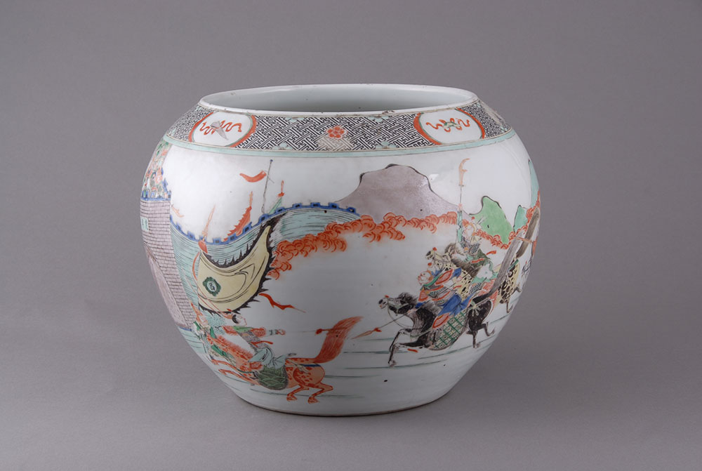 清虎牢关三英战吕布人物粉彩瓷缸,口径17.2,高30.3,足径20厘米,敛口,圆唇,鼓腹,最大径在上腹,假圈足.白胎较厚,满施釉,削足.外壁近口部三条凹弦纹将纹饰分为上下两层,上层粉彩彩绘有对称的四个开光图案,间以梅花等纹饰.主体纹饰在第二层,粉彩绘有"三英战吕布"以及松树.远山等图案。