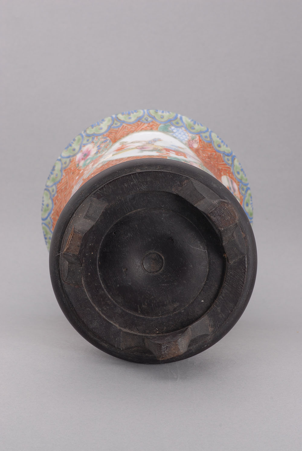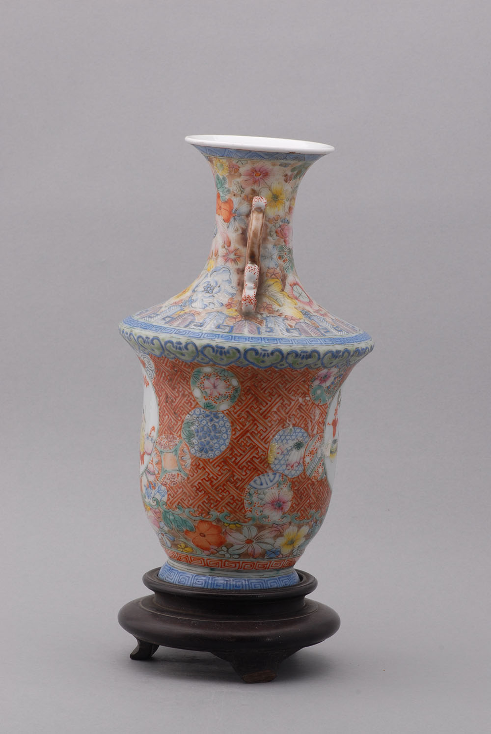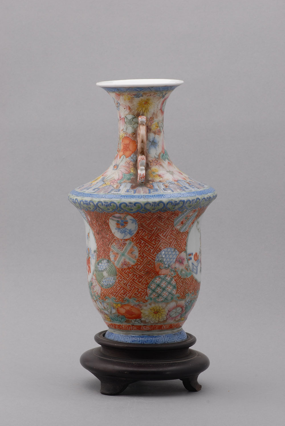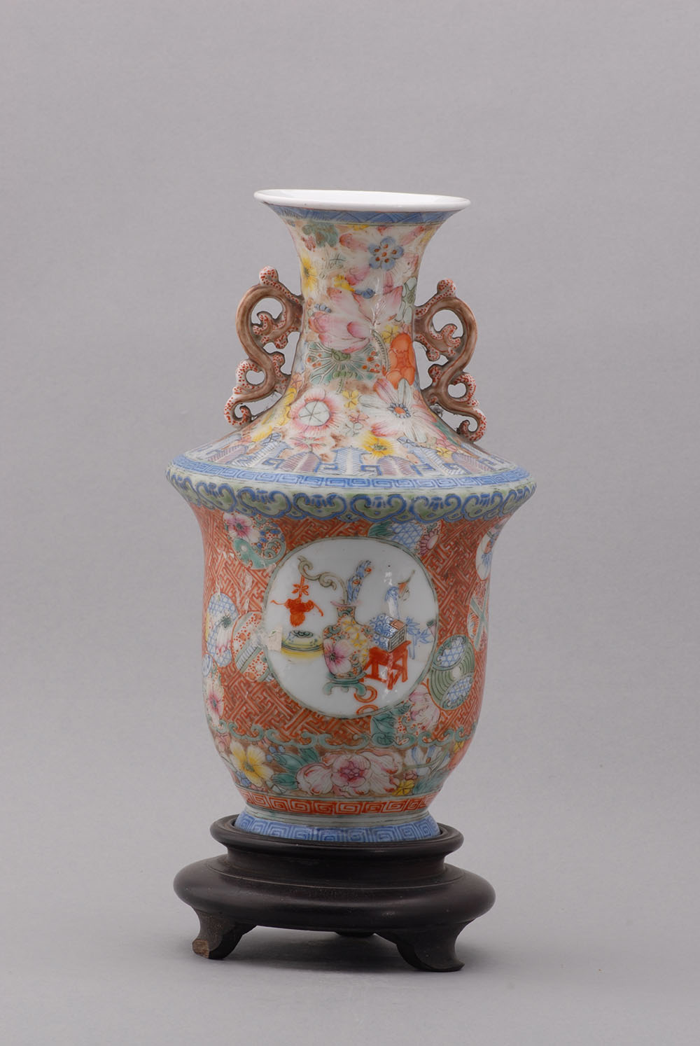 口径7.4,通高26.7,足径11.2厘米,敞口,细颈,宽肩,曲腹,下收,圈足外撇嵌于紫檀木座上,颈部两侧有夔龙形耳。通体施粉彩,绘以花卉,万字文格纹及其吉祥图案。