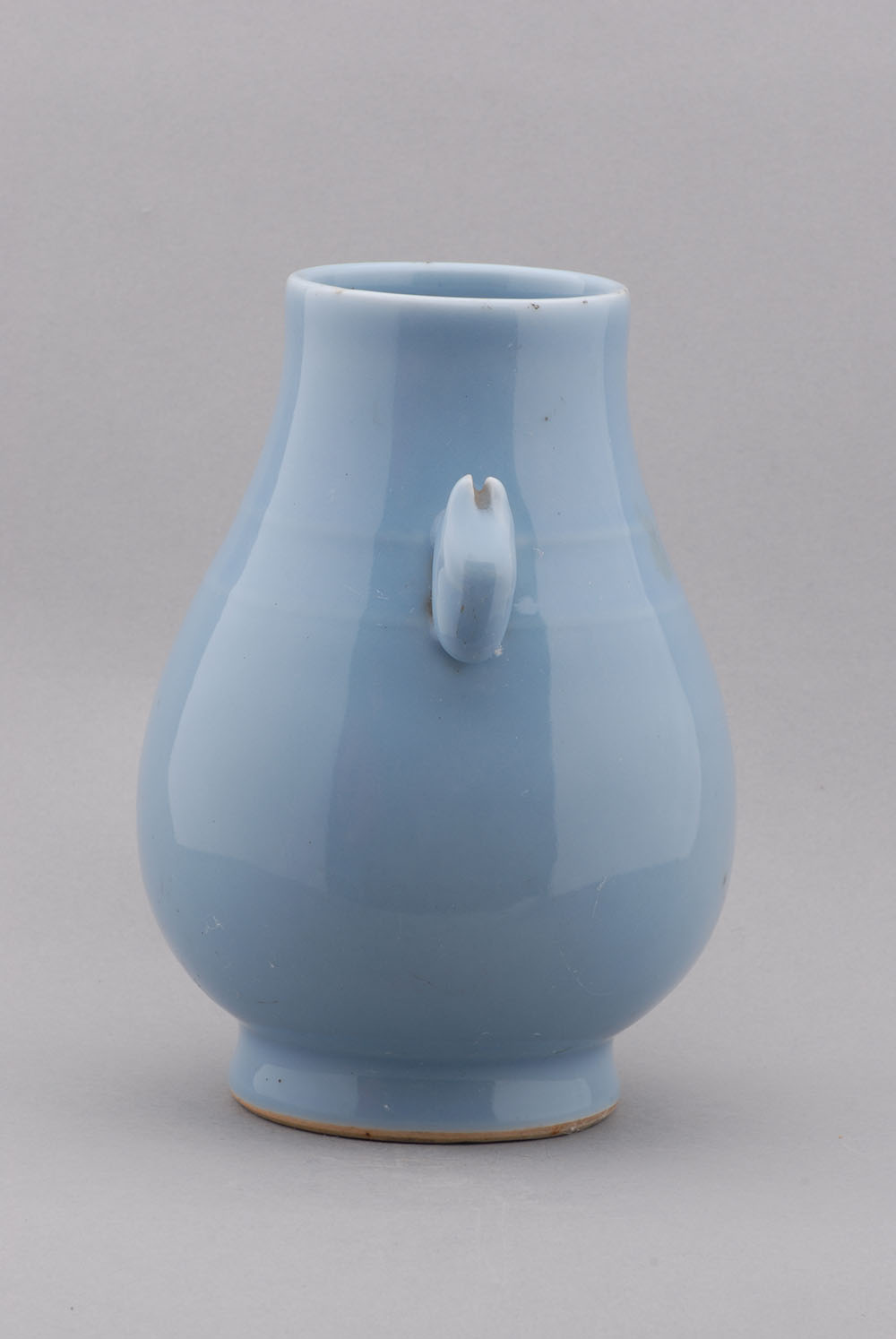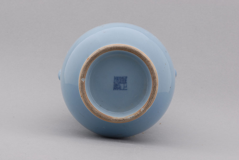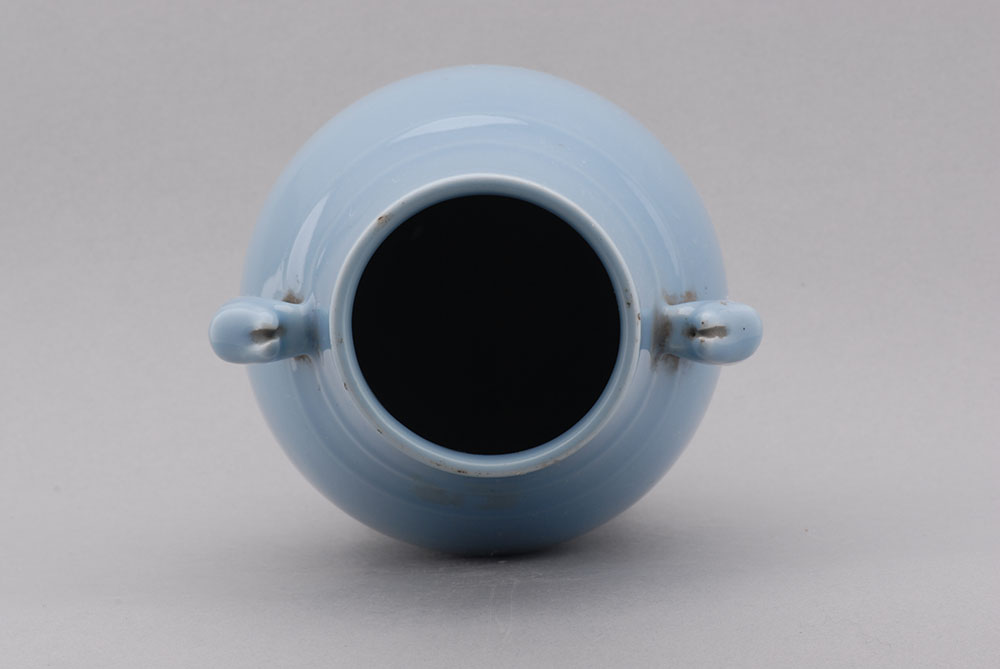 口径7.4,通高18.4,足径8.4厘米,直口,圆唇,肩部有二道凸粗弦纹及对称兔头双耳,下腹鼓,圈足,足底露灰白胎,通体施淡兰色釉,器底有篆书“雍正年制”款。