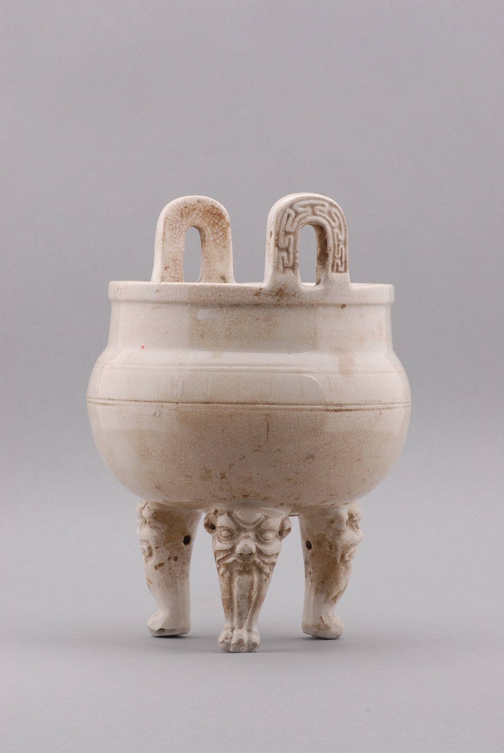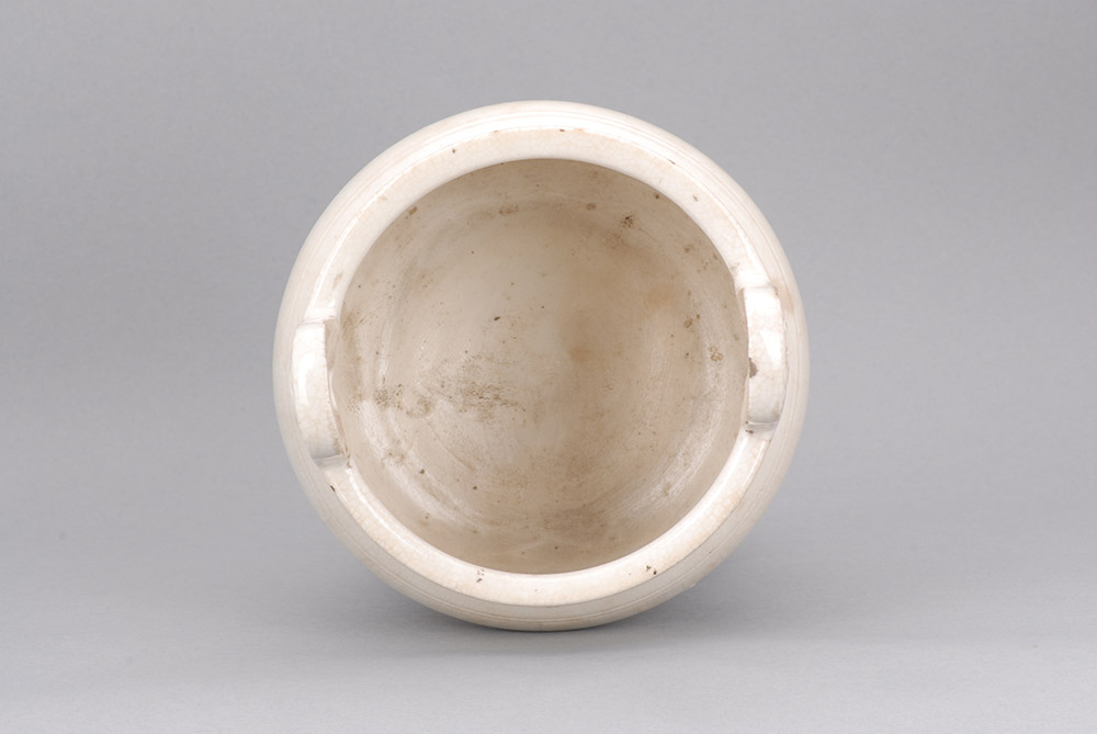 口径12.50,通高20.00,底径9.00厘米,直口,平沿,沿上立有两对称耳,直颈,鼓腹,圜底,有三兽首足,器体通施白釉。