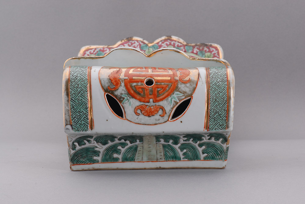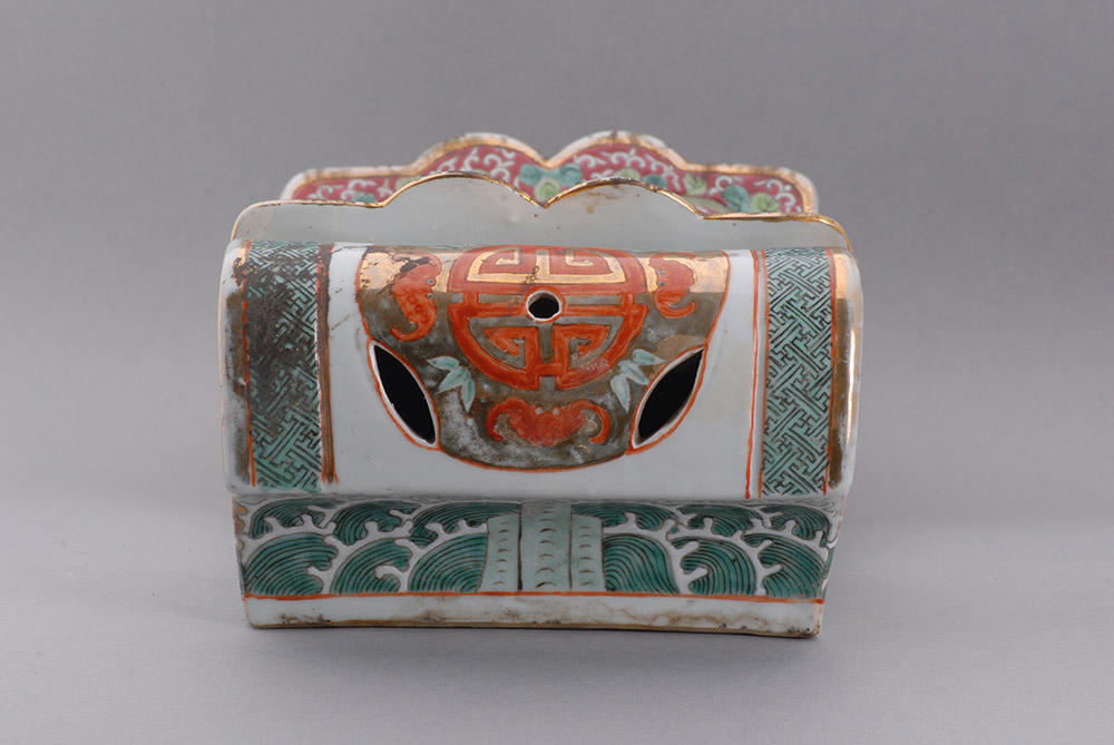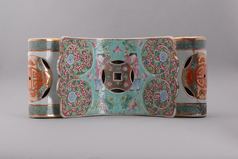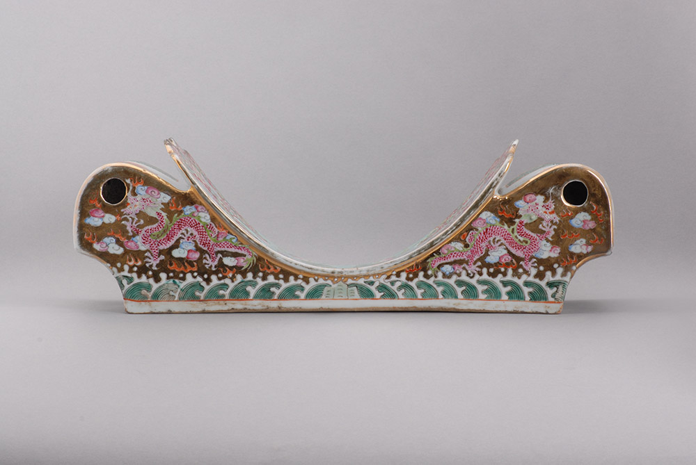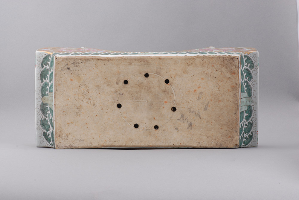 清团花婴戏彩瓷枕,长33,宽15.6,高12.3,枕呈腰形,枕面两侧呈荷叶边,上翘,中部下凹,上有钱形孔,枕面中部绘有二童子持荷,两边为4组花卉纹,枕肩外凸,两边各有一道“万”字格纹,肩上有蝙蝠、瓦当纹,呈圆团,上有4叶形孔,中有小圆孔,枕壁两边上方各有一小圆孔,中部有7个小圆孔呈圆圈排列,壁面上方金色,左右绘云龙纹,枕身下端有一圈海波纹,底平直无釉彩。