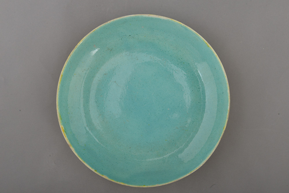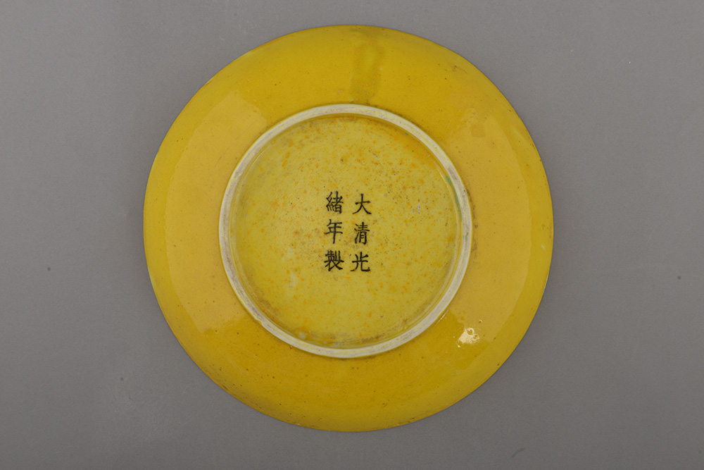 盘内呈淡绿色釉,盘外壁及底部呈黄色釉,弧腹,圈足,足底部印有“大清光绪年制”字样。