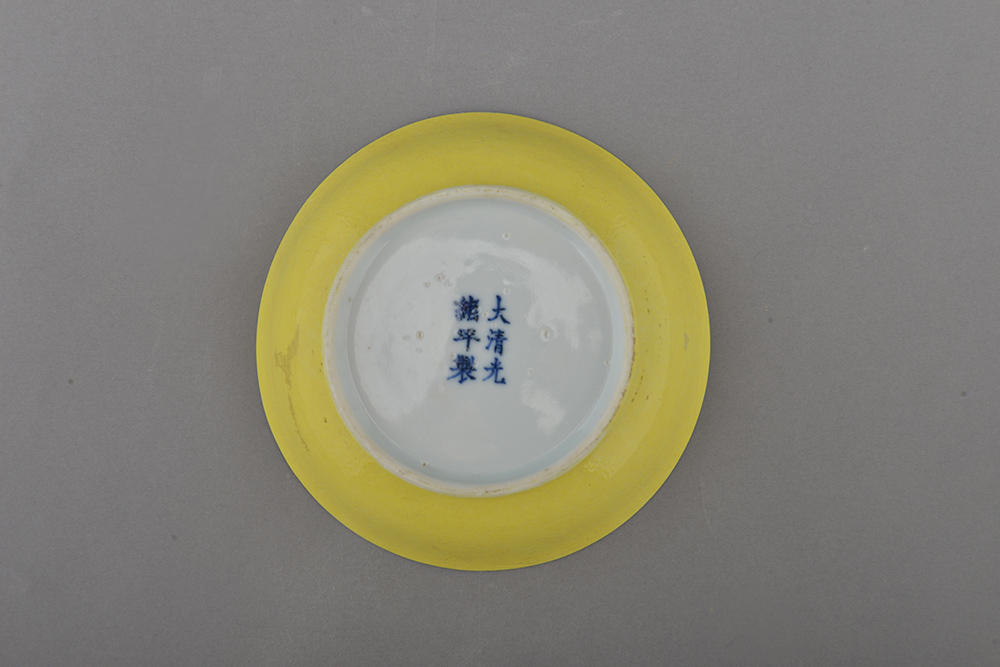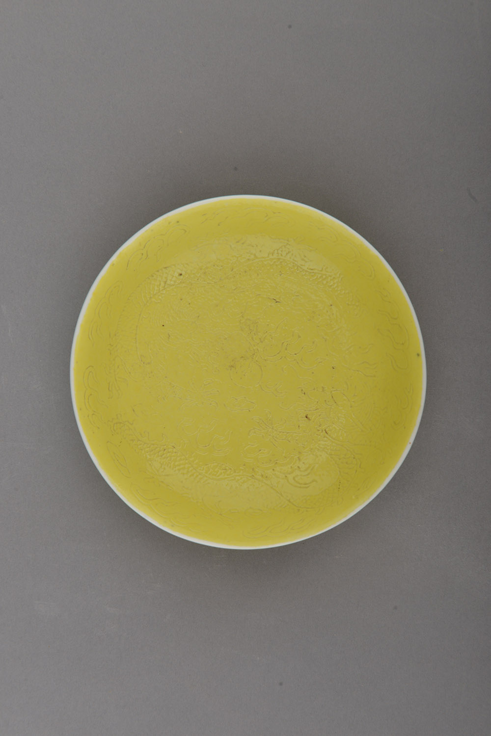 口径10.3,高2.3,底径6.6厘米,通身施有黄色釉瓷,口沿呈白色,碟内刻有云龙图形,底部印有“大清光绪年制”