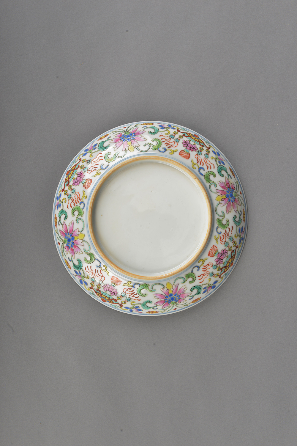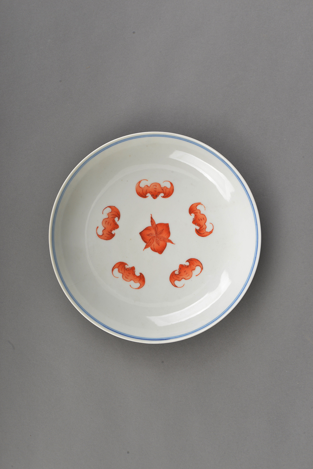 口径15.50,底径9.50,高3.40厘米,盘内底部绘有彩色红蝠,盘外腹部施有彩色花卉及各类图案,弧腹,圈足。