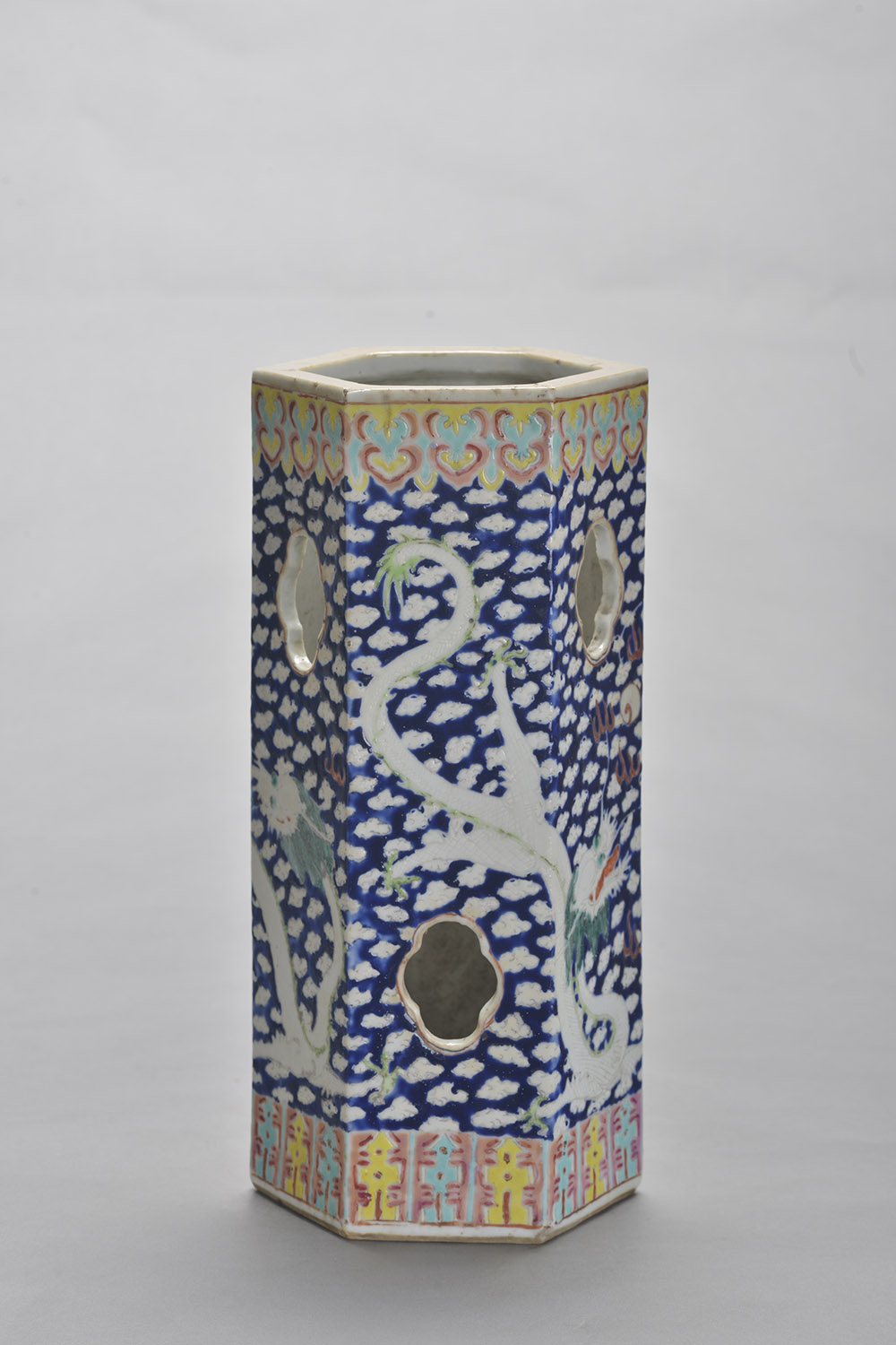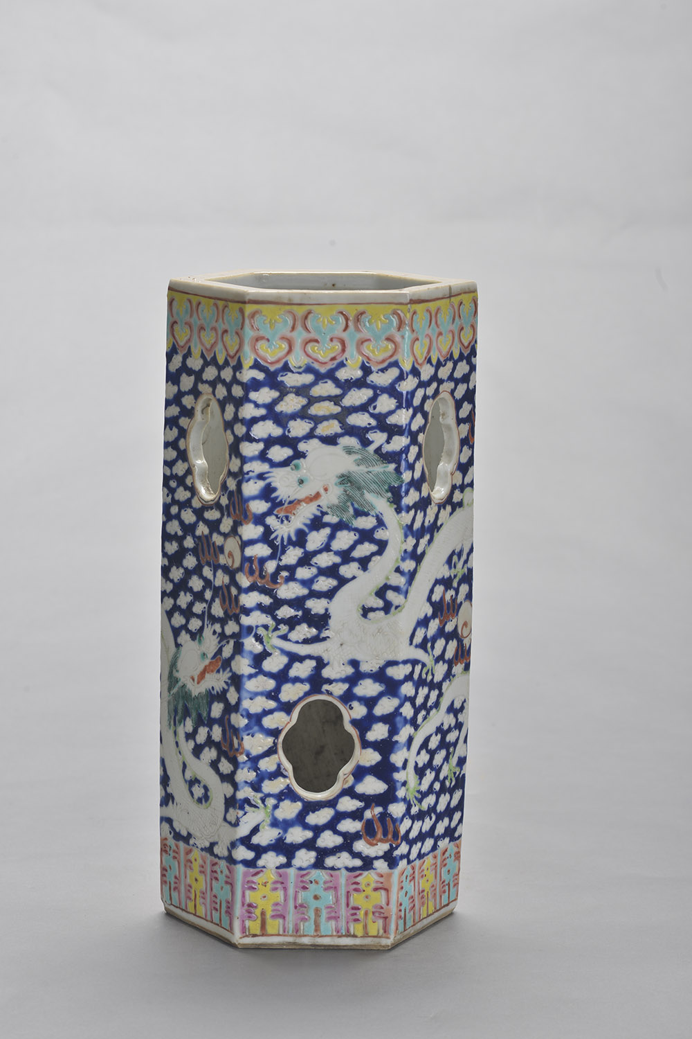 清蓝底粉彩云龙纹六角形瓷帽筒