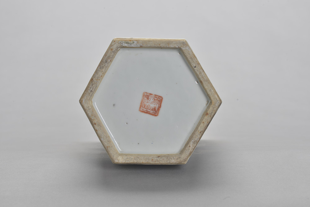 清“大清同治年制”款六方形开窗人物瓷帽筒,