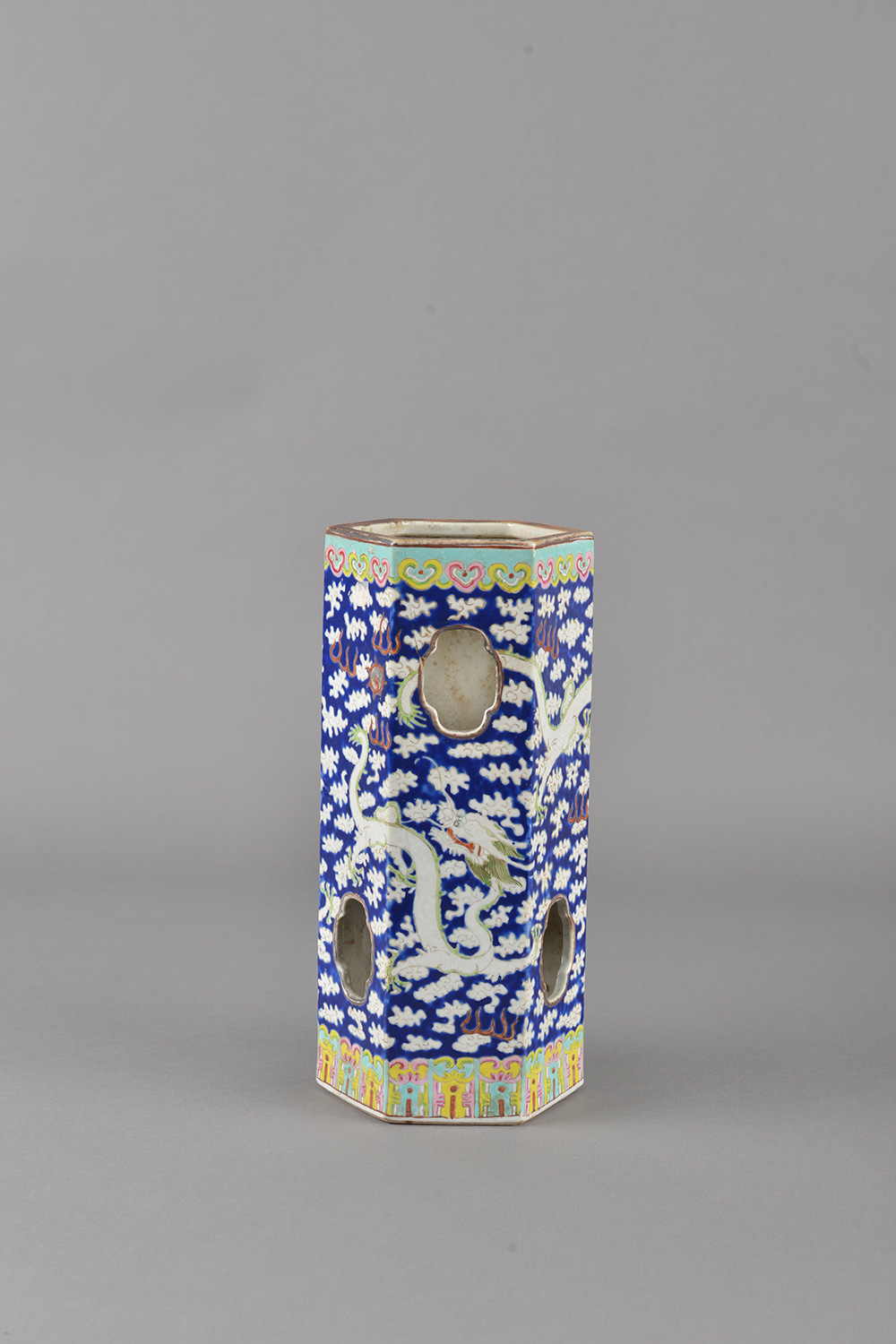 清蓝底粉彩云龙纹六角形瓷帽筒